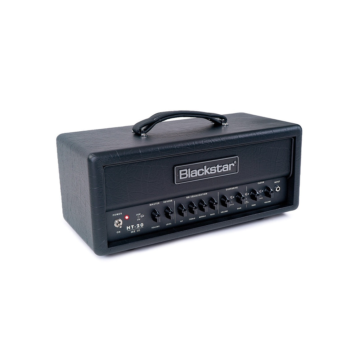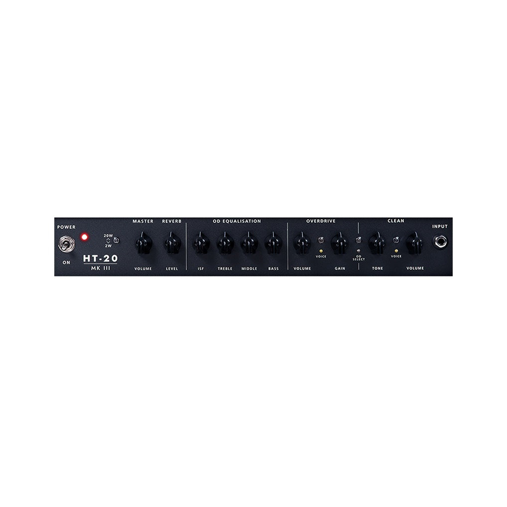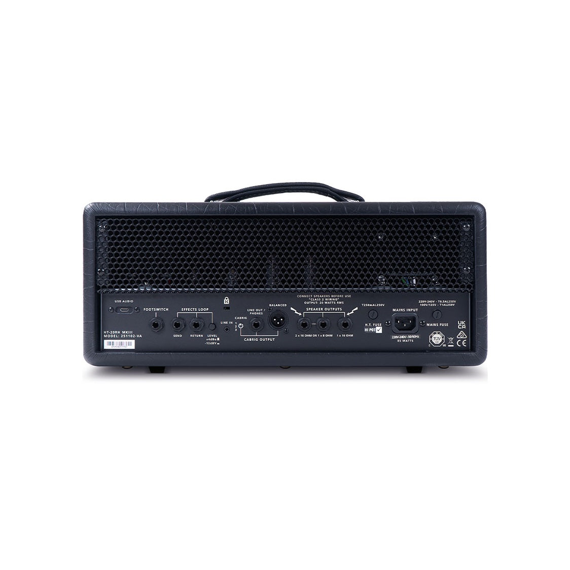 HT 20RH MkIII är en rörtopp på 20w med 2st ECC83 i preampen och 2st EL34 i slutsteget. Den har CabRig IR-baserad DSP-högtalarsimulering och USB-utgång med låg latency samt effektreducering till 2 watt.