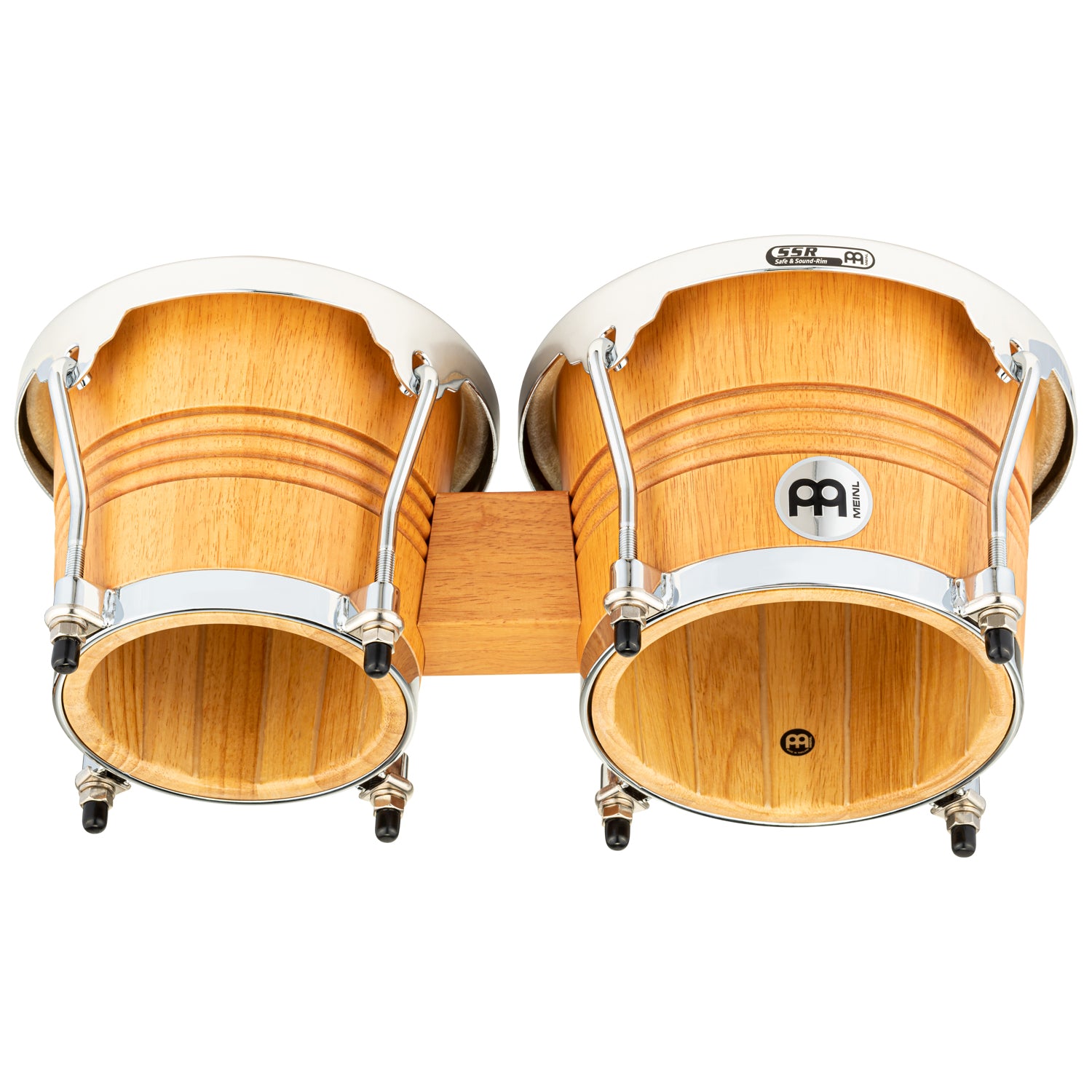 Klassiska träbongos av Siam Oak (gummiträd) med utvalda buffelsskinn. Massivt träblock mellan trummorna ger mer traditionellt ljud och utseende.