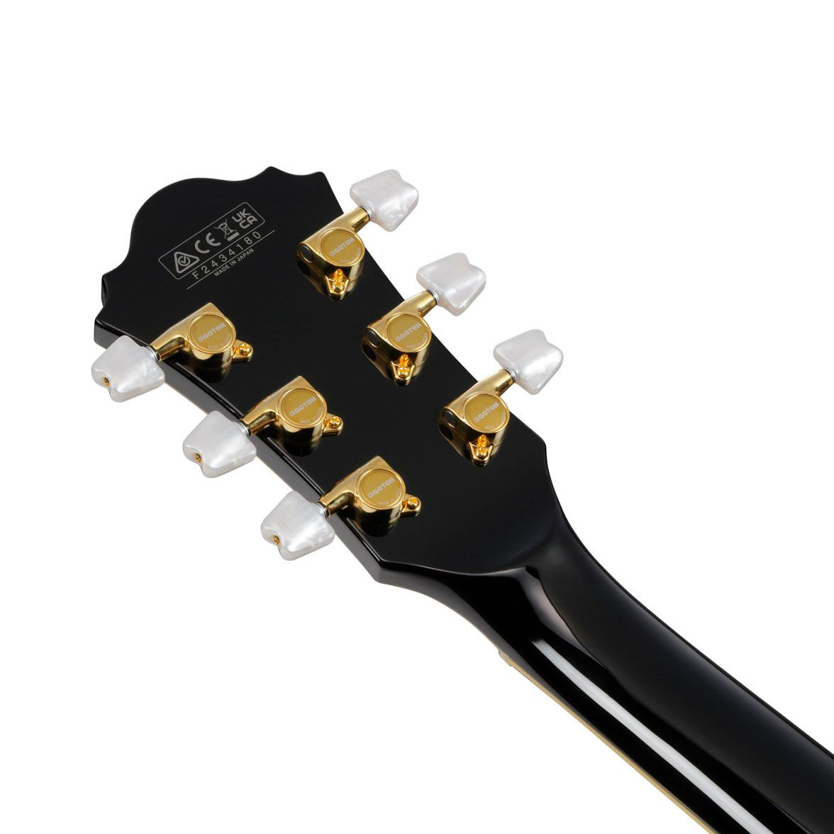 - Bound Ebony fretboard med Acrylic och Abalone blockinlägg
