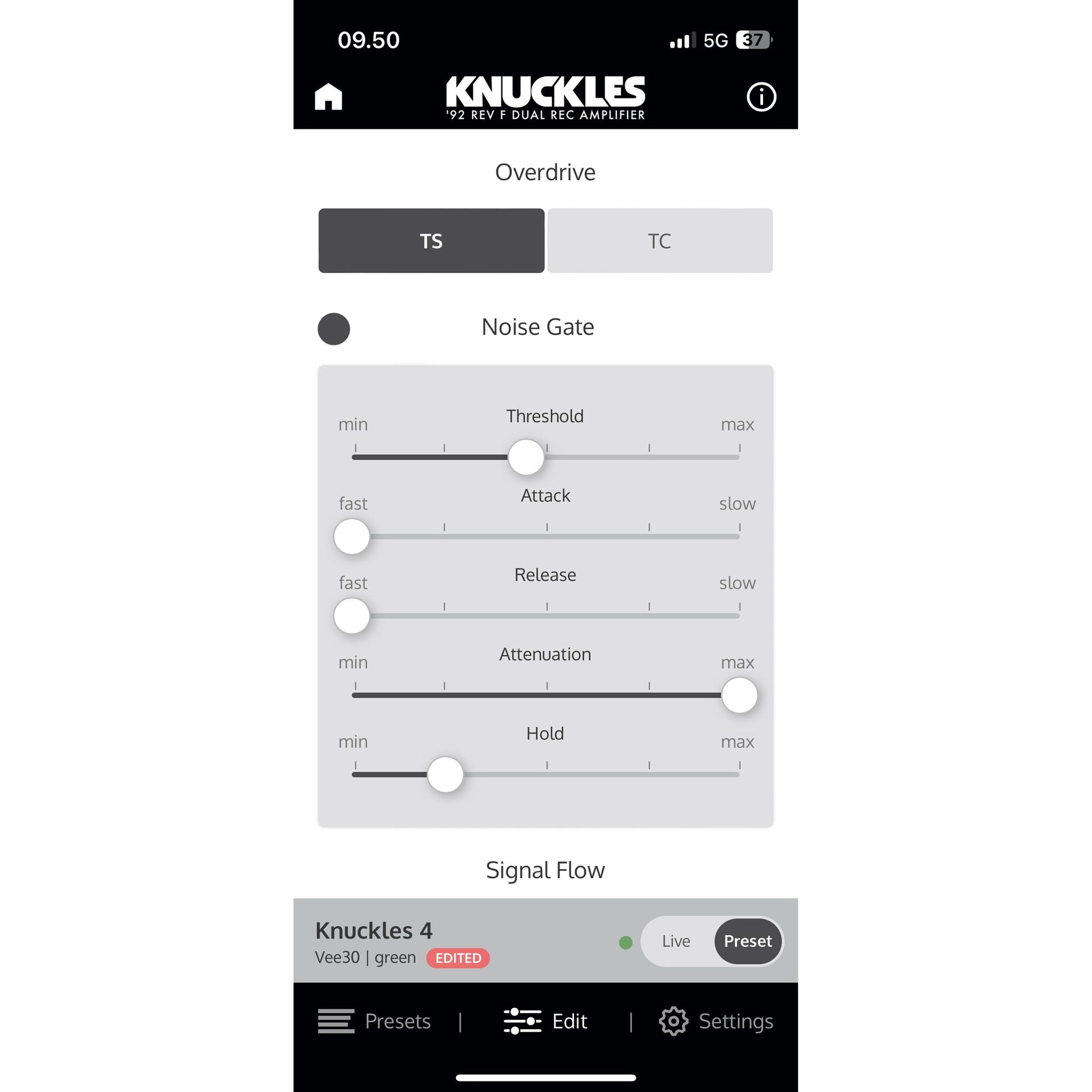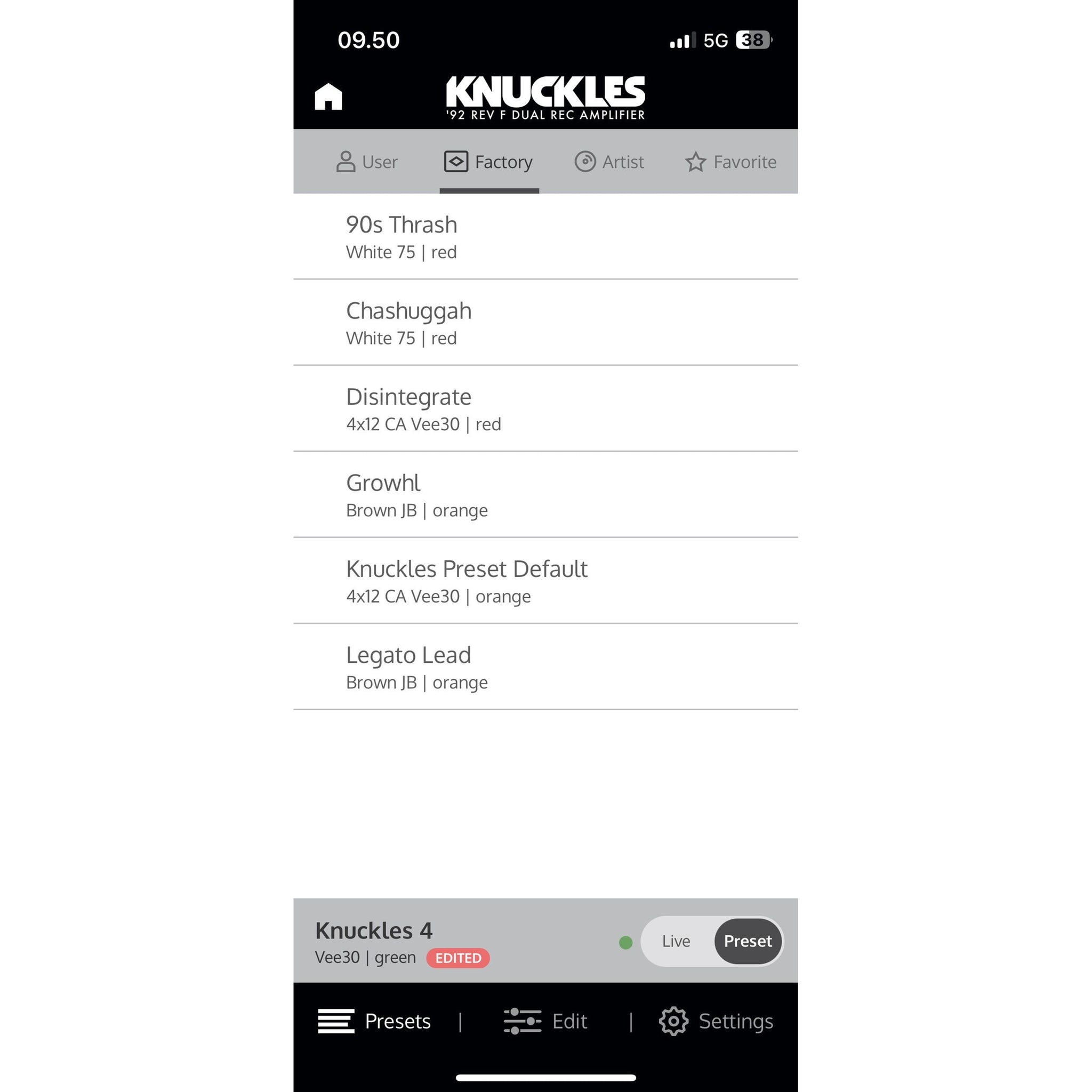Knuckles´92 kommer med 6 st klassiska mic- och speaker set, TS-Style Overdrive/Boost, noise gate och ger dig en av high-gain historiens mest klassiska förstärkare, Rev F Dual Rectifier, allt i en pedal.