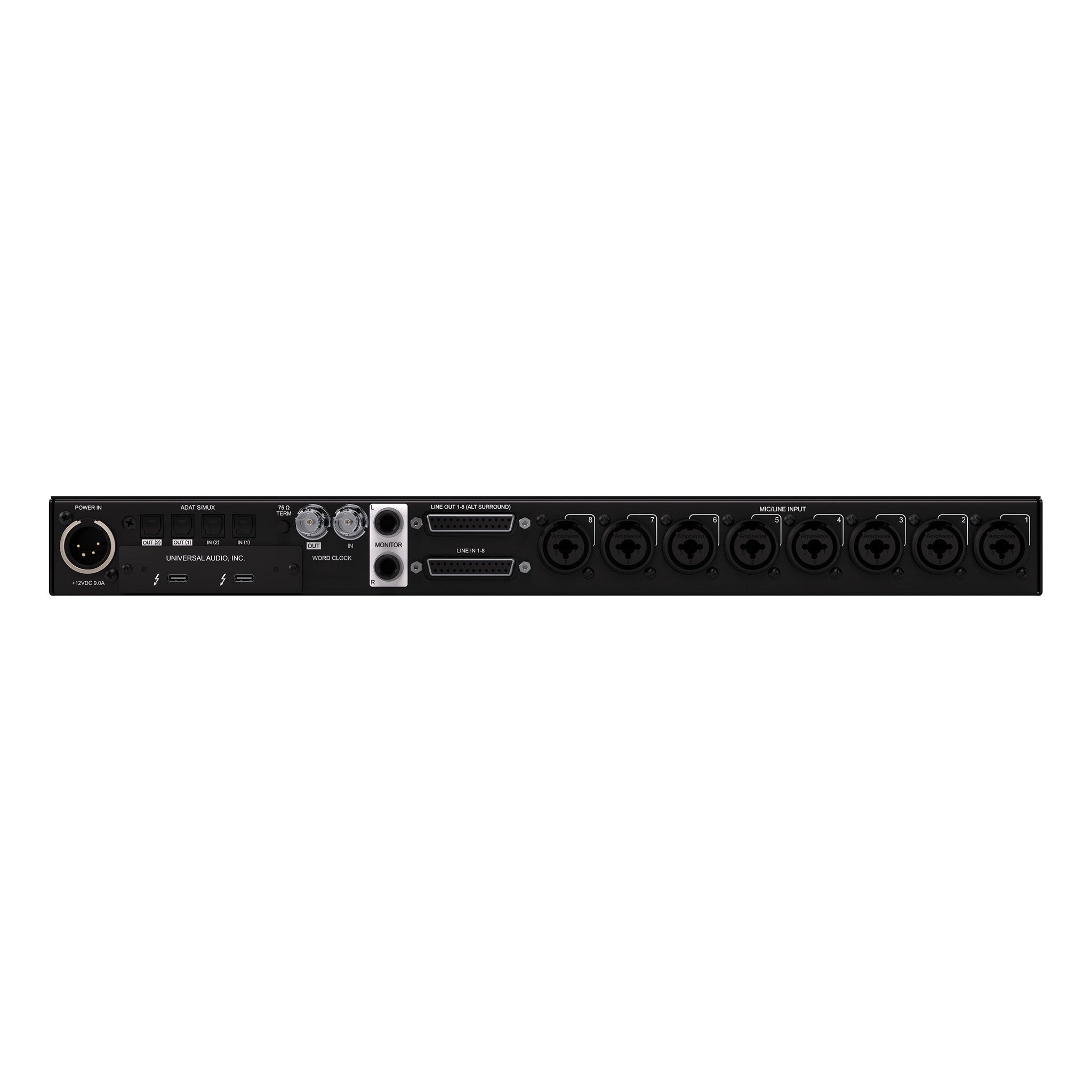 • Eight UnisonTM mic preamps, two Hi-Z instrument inputs, DB-25 input (line 1-8), two optical Toslink I/O (ADAT S/MUX or S/PDIF), word clock I/O (BNC)