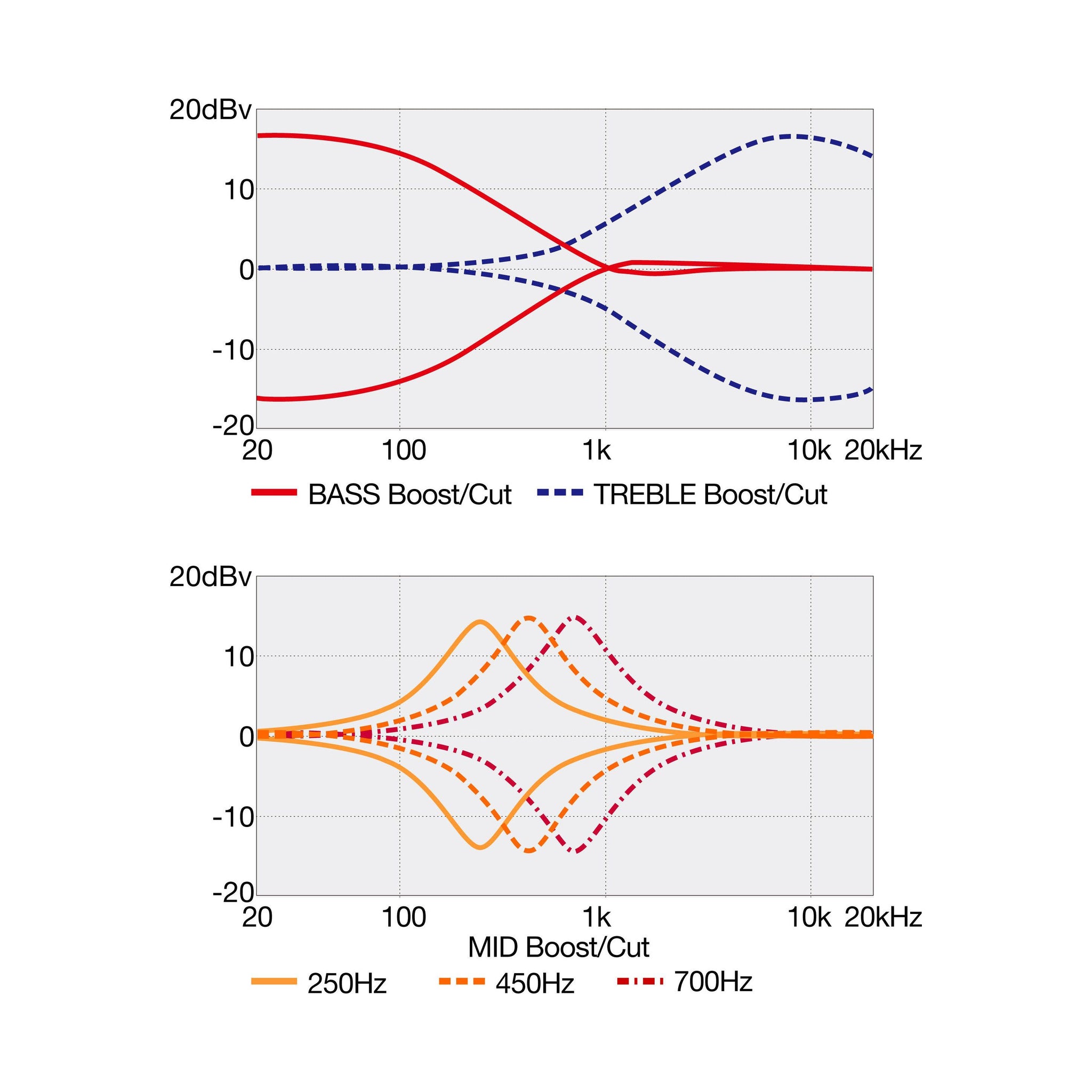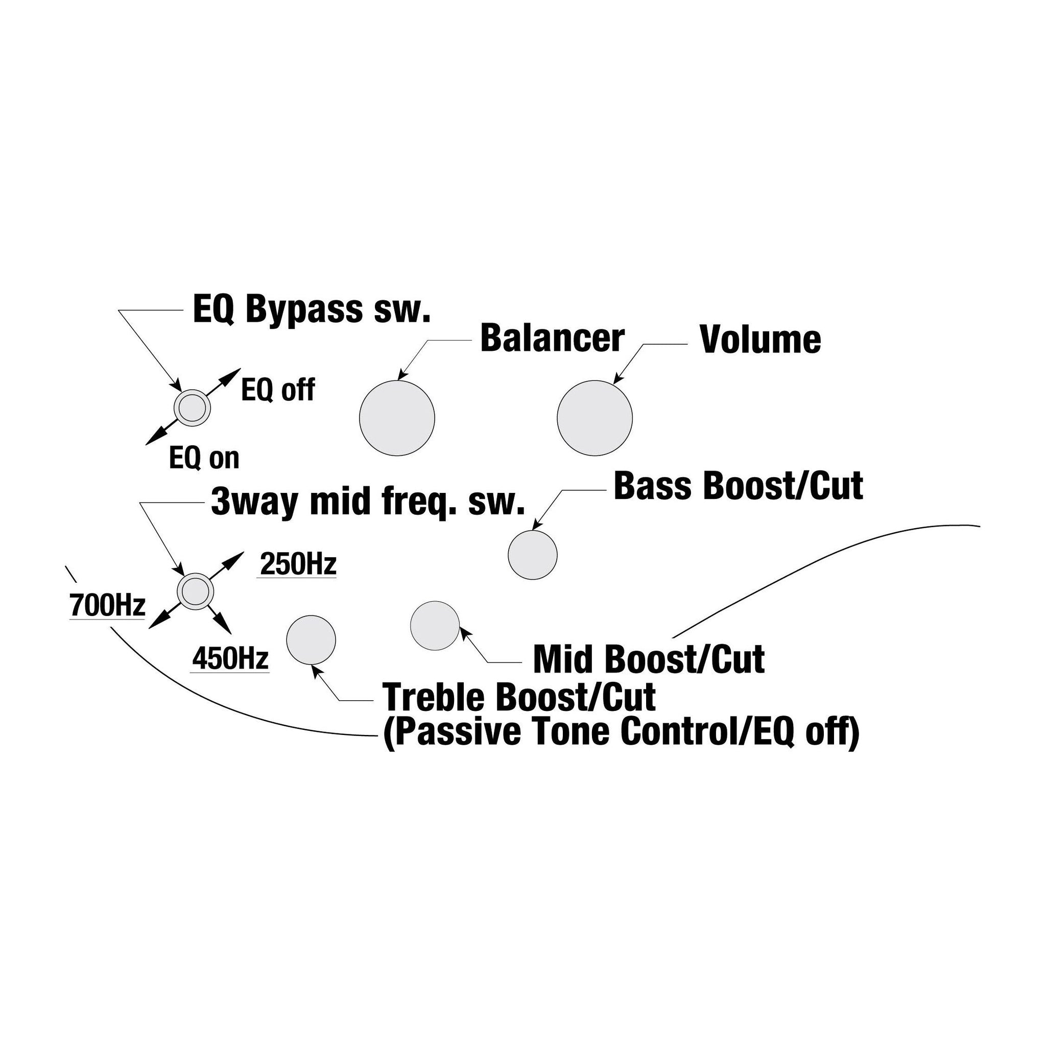 EQ'n går att koppla in eller ur så att man helt kan koppla förbi hela EQ-systemet och få mickarna direkt till outputjacket med en liten on/off toggle switch. EQ-systemet består av 4 pottar, en +/- 12db boost/cut för basen, en +/- 12db boost/cut för diskanten och ställbart Q-värde och en +/- 12db boost/cut för det så viktiga mellanregistret. Allt har en gemensam volym och en pott för balans mellan hals och stallmick.