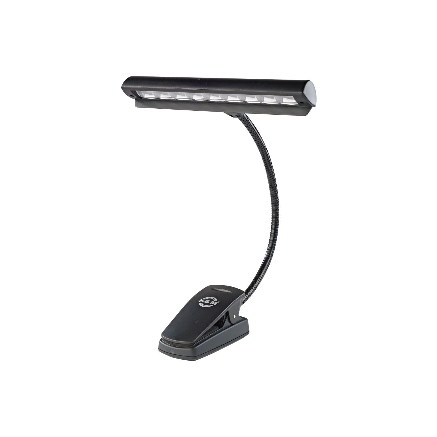König & Meyer Music stand light "Led FlexLight" är en rejäl notbelysning med hela 9st  LED, monterade i en rad för att lysa upp en bredare del av notpapperna. Den drivs med batterier eller nätadapter som båda ingår.  Du kan klämma fast den på material med en tjocklek på upp till 20mm.