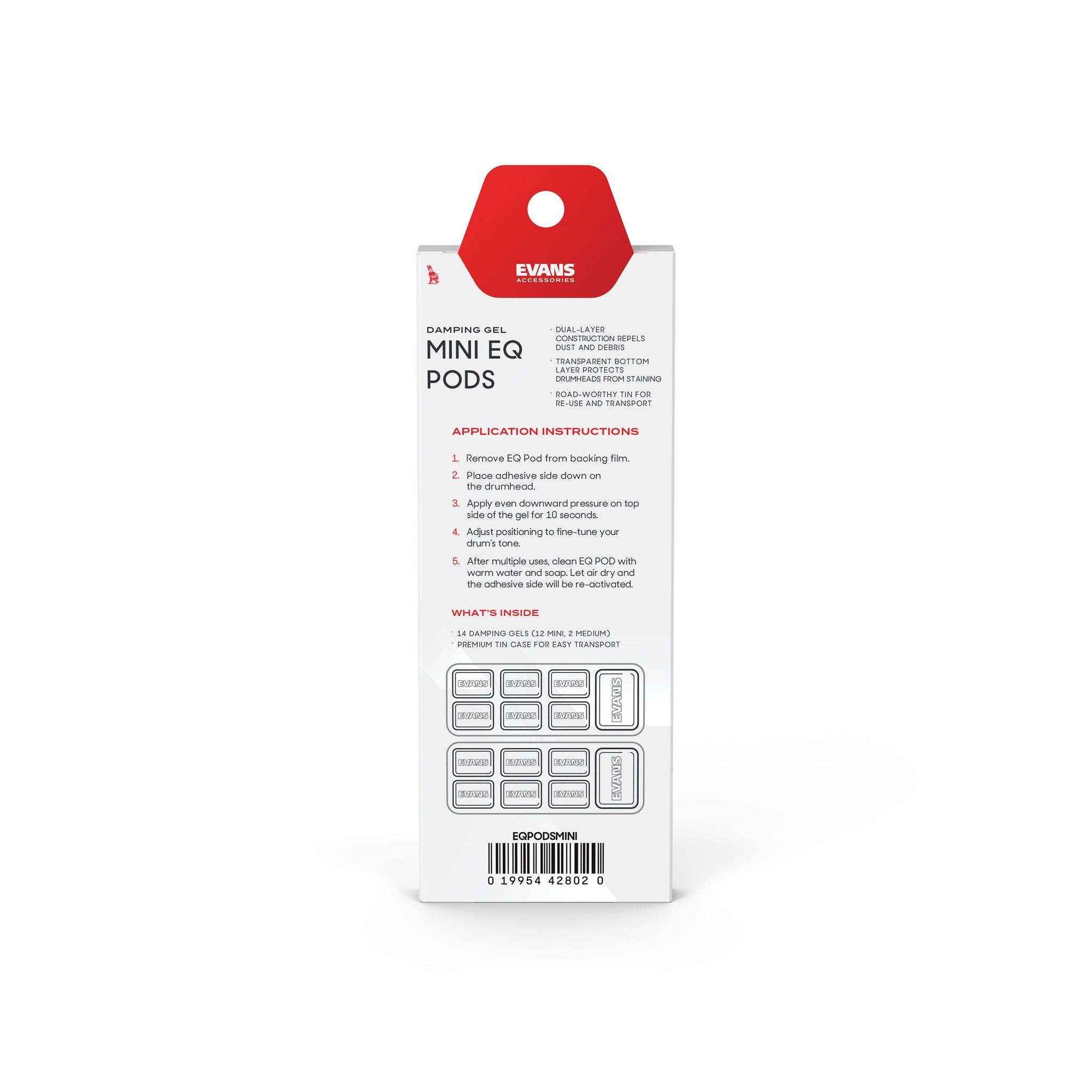 Modifiera ditt sound med Evans EQ Pods och kontrollera övertoner, resonans och trumskinnets efterklang. EQ Pods polymergel är ovanligt formstyva och har en teflonbeläggning på ovansidan som är dammavvisande. Undersidan har mycket god vidhäftning och fungerar även på klara underskinn. EQ Pods appliceras enkelt på och av skinnet, ko-klockan och andra ytor – utan att lämna märken. Efter en tids användning sköljer man EQ Pods i vatten för att återställa den goda vidhäftningsförmågan. EQPODSMINI levereras i ett etui innehållande tolv minipods och två medium EQ Pods.