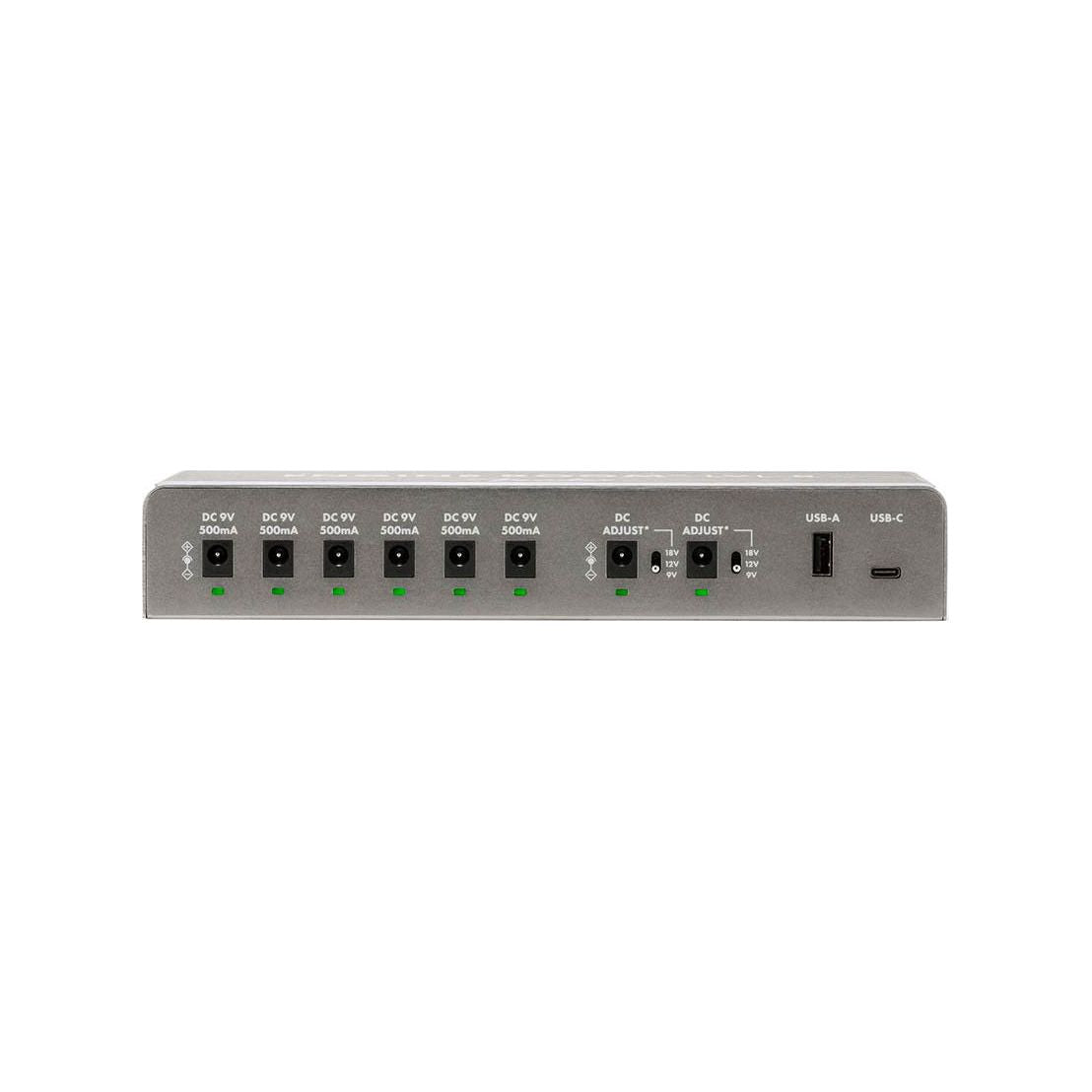 - 8 jordisolereda utgångar – 6 uttag för 9Vdc vid 500mA och 2 uttag med switchbar spänning(9v/12v/18v)
