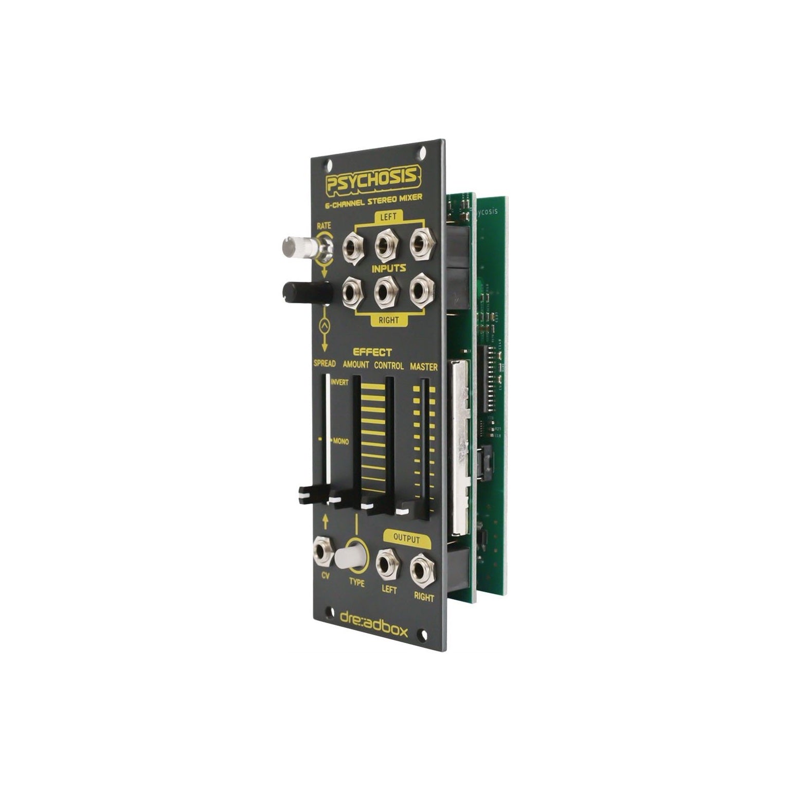Dreadbox Psychosis är en kreativ och kraftfull 6-kanals stereomixer i Eurorack-format, framtagen för modulära system där mixning och effektbearbetning är en del av ljudskapandet. Med inbyggda effekter, avancerad stereokontroll och modulering öppnar Psychosis upp för djupa, breda och experimentella mixar direkt i ditt rack.