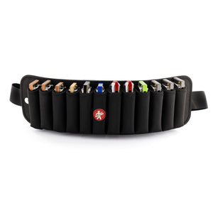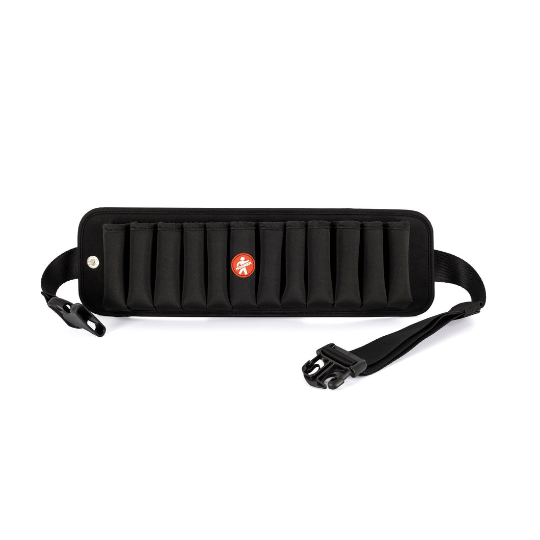 FlexBelt erbjuder erbjuder utrymme för upp till 12 diatoniska munspel, är praktisk och bekväm att ha på sig och går snabbt och enkelt att justera för olika kroppsdimensioner.