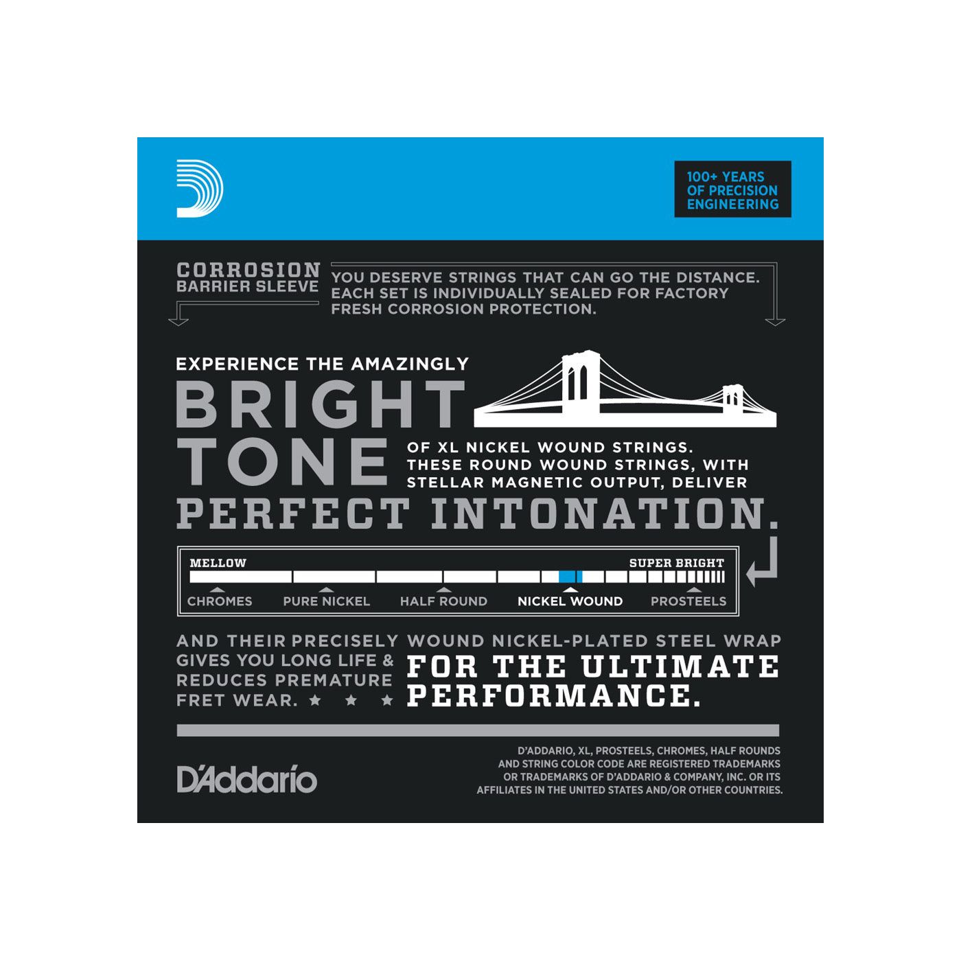The XL Nickel Wound is D'Addario's most used and popular string. Nickel plated steel, precision spun on a carbon steel hexagonal core, provides a flexible string with a distinct and clear sound character combined with excellent intonation. Ever since its birth in the sixties, guitar and bass heroes in all genres have chosen to use these strings on their instruments.