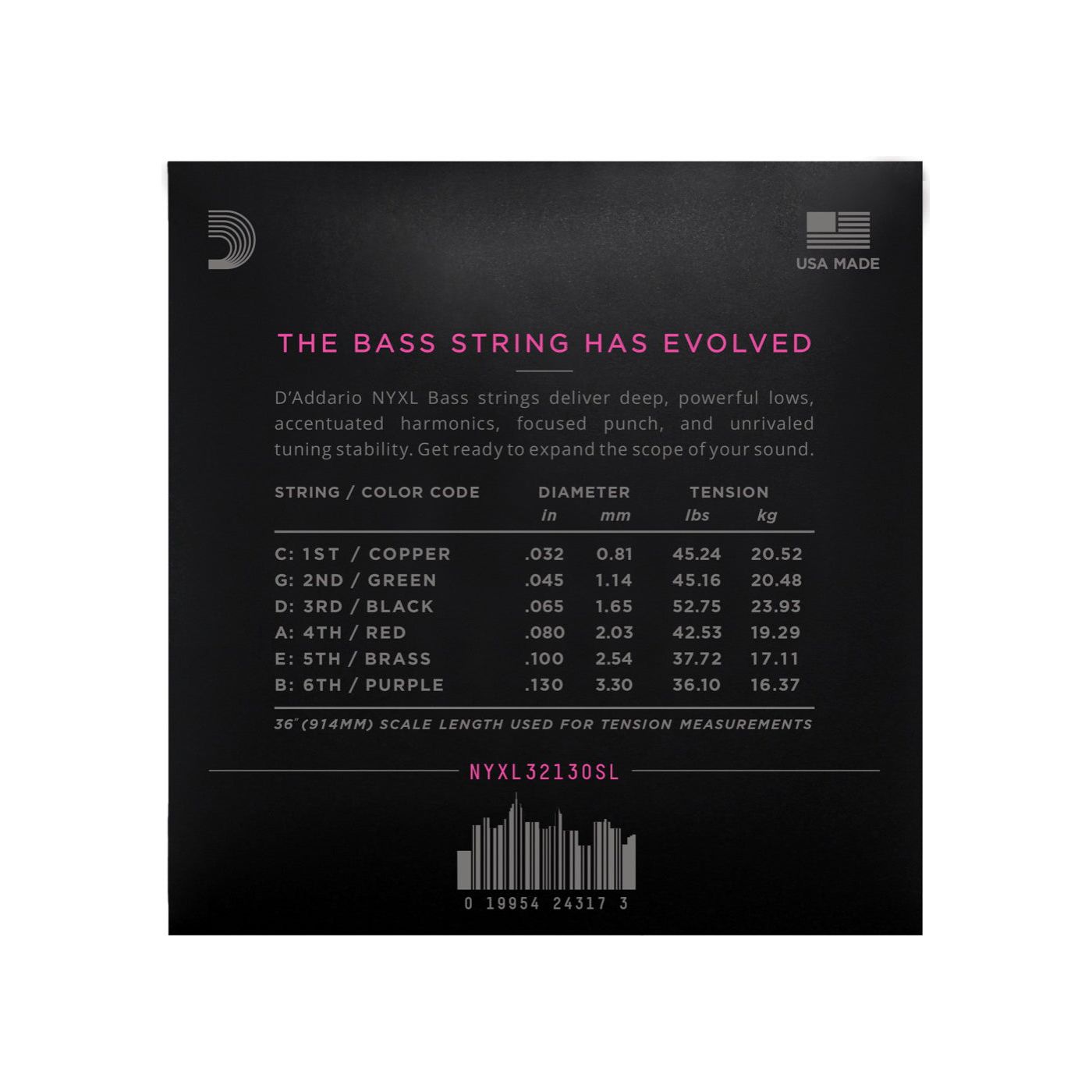 The NYXL Bass combines D'Addario's steel carbon core, NY STEEL, with a redesigned nickel-plated steel spinning. This construction provides a deep and powerful bass tone with a focused, tight and punchy midrange and a complex harmonic range. Designed for all playing styles, the NYXL Bass has a greater dynamic range and longer sustain than any other bass string.