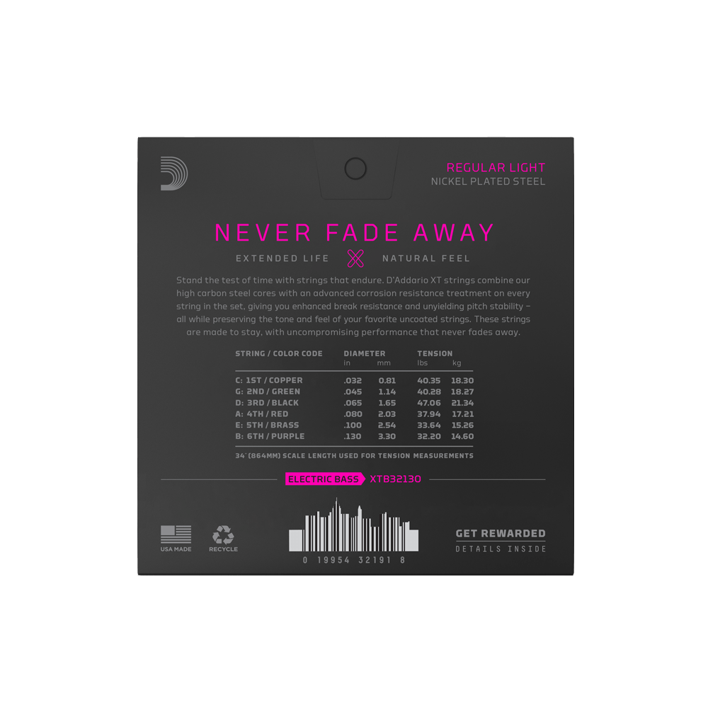 Each individual string in a set of XT is treated with D'Addario's protective microcoating, a super-thin surface treatment that effectively repels dirt and sweat. The XT strings last 4 times longer than traditional uncoated strings without affecting the tone and playing feel that D'Addario's strings have become recognized for. D'Addario's unique steel carbon core in combination with a strong anchoring of the ball, through so-called Fusion Twist technology, gives a string with unparalleled strength and which holds the tuning significantly better than ordinary strings.