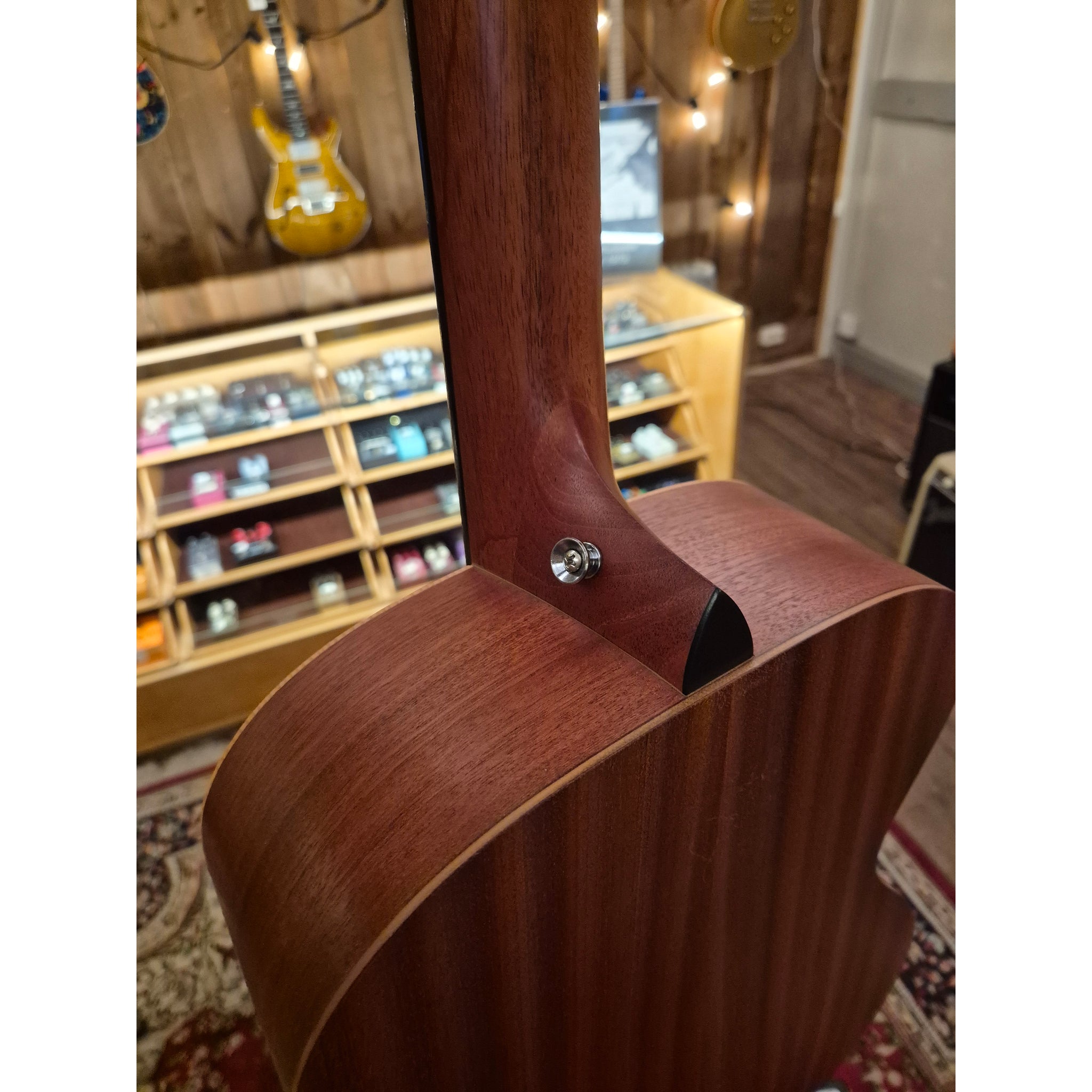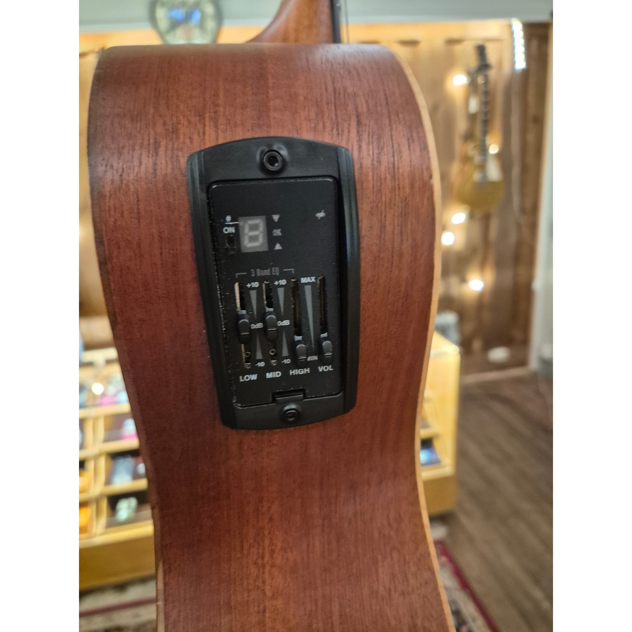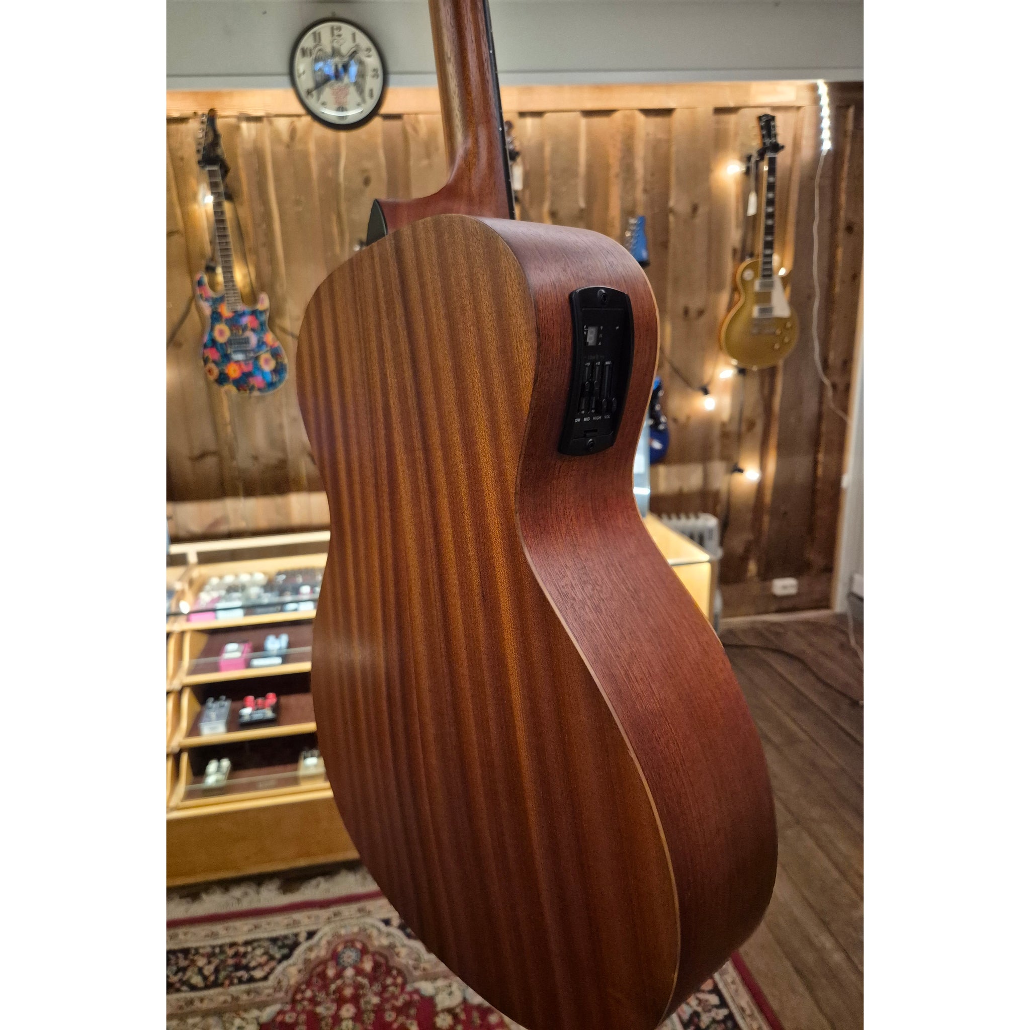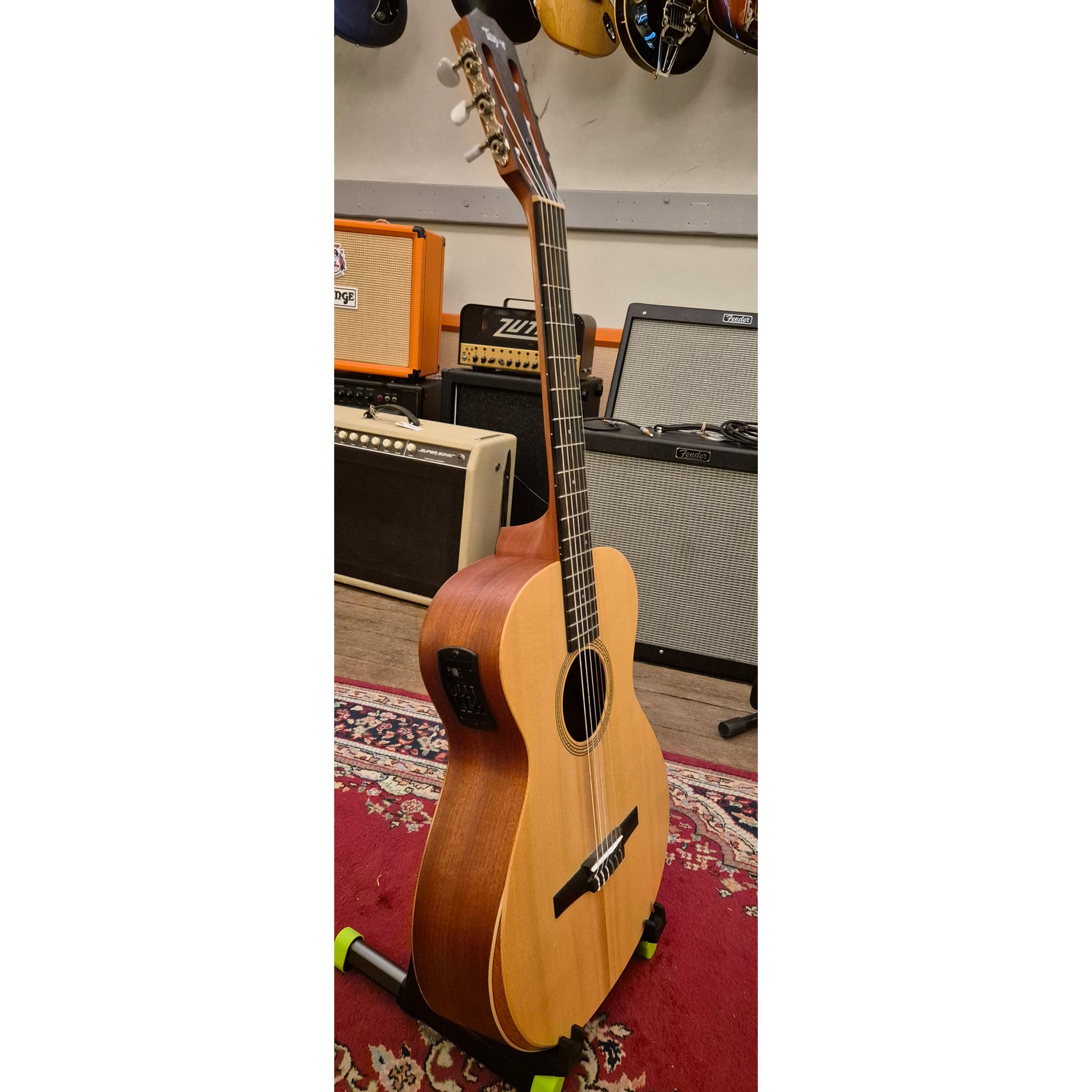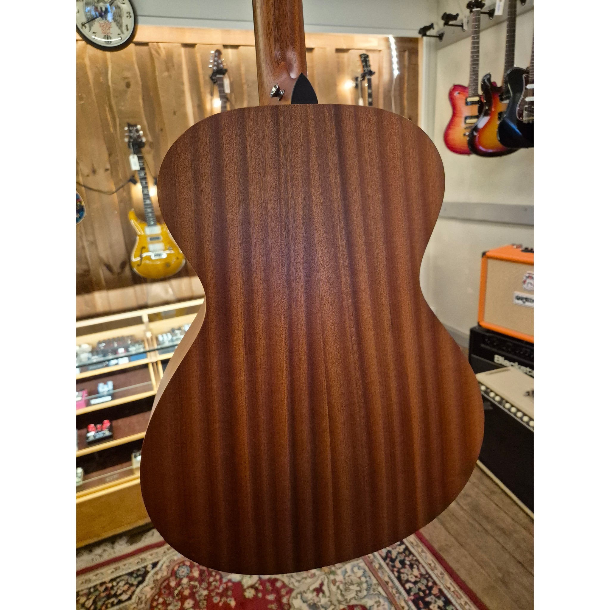 Toppen är gjord av massivt granträ som behandlats med en särskild rostningsprocess. Det ger ett fylligare djup och en varm klang samtidigt som gitarren behåller sin tydlighet och projektion.