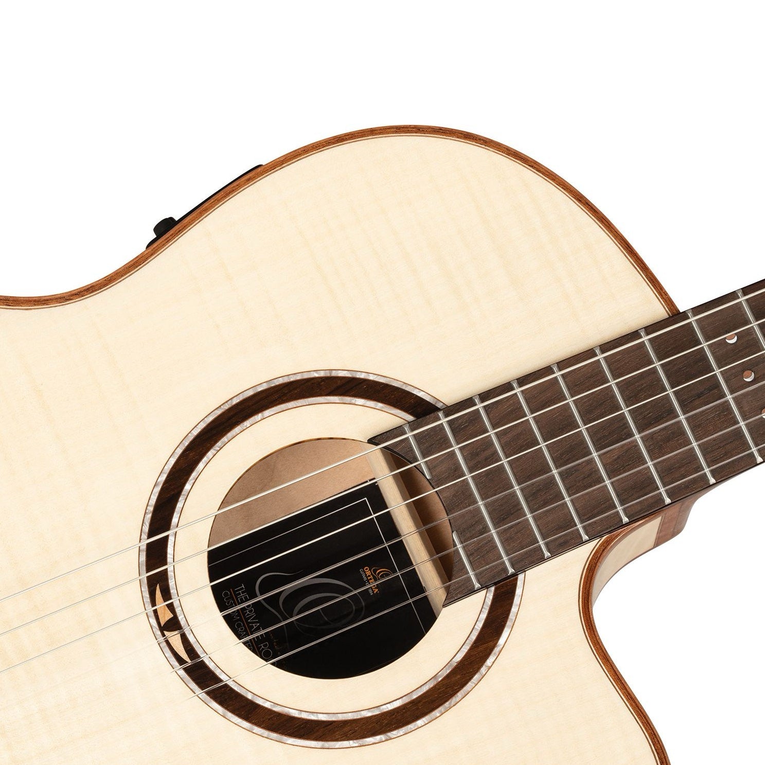 Ortega Bridesuitece The Private Room Series är en exklusiv nylonsträngad thinbody-gitarr designad för scenbruk där elegans möter professionell prestanda. Med solid flammig lönn, uppladdningsbar elektronik och genomtänkt komfort är detta ett förstklassigt val för livegitarrister som vill kombinera visuell wow-faktor med klar och artikulerad ton.