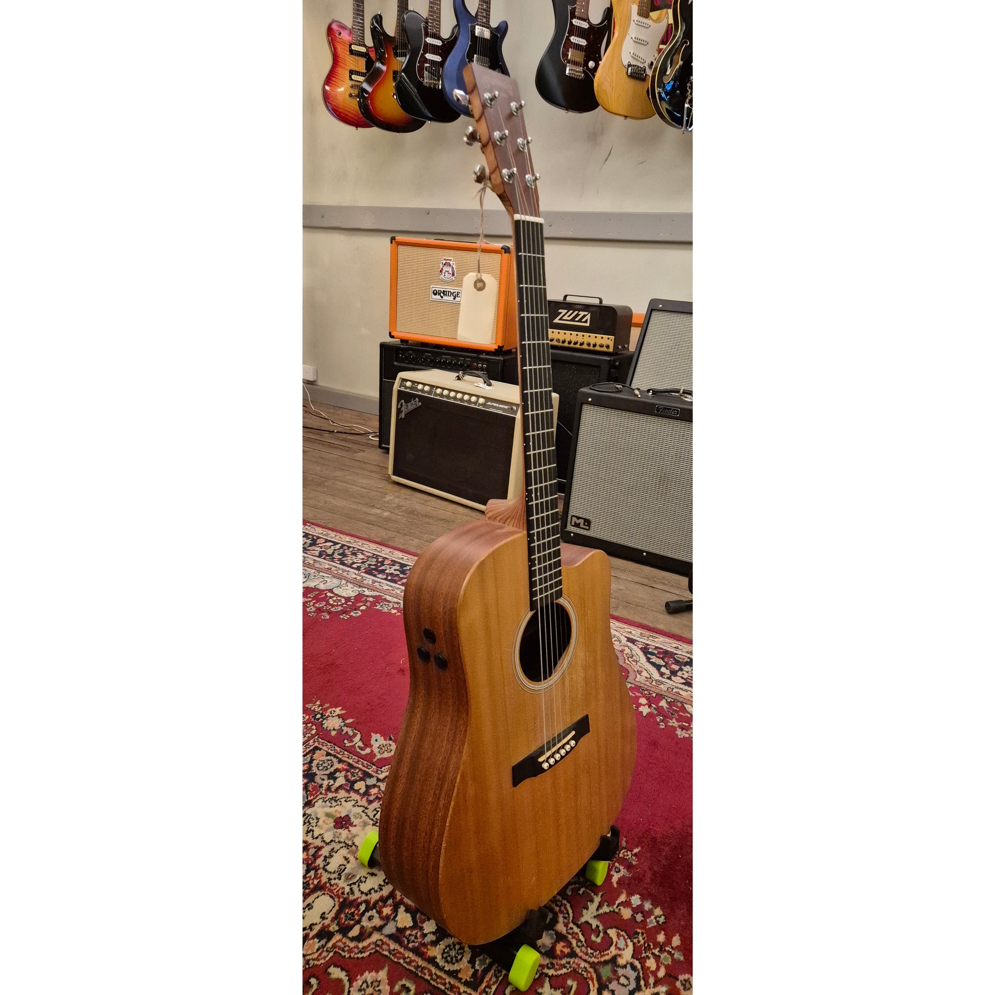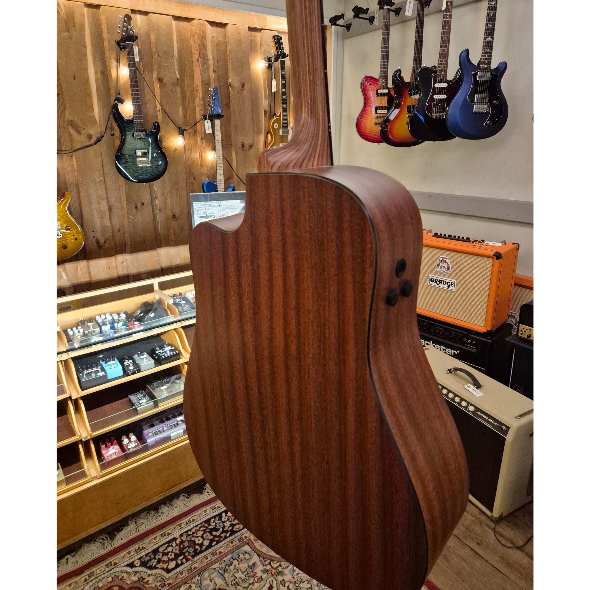 Gitarrens topp är tillverkad av massiv gran med handrubbad finish som ger ett naturligt utseende och låter träet resonera fritt.
