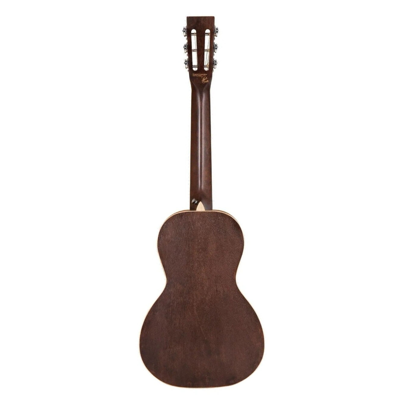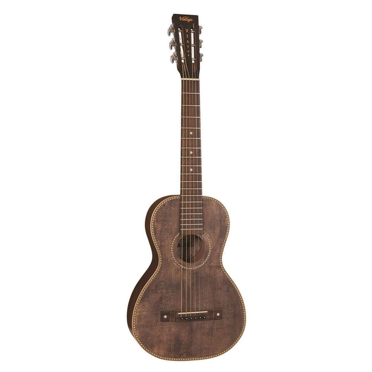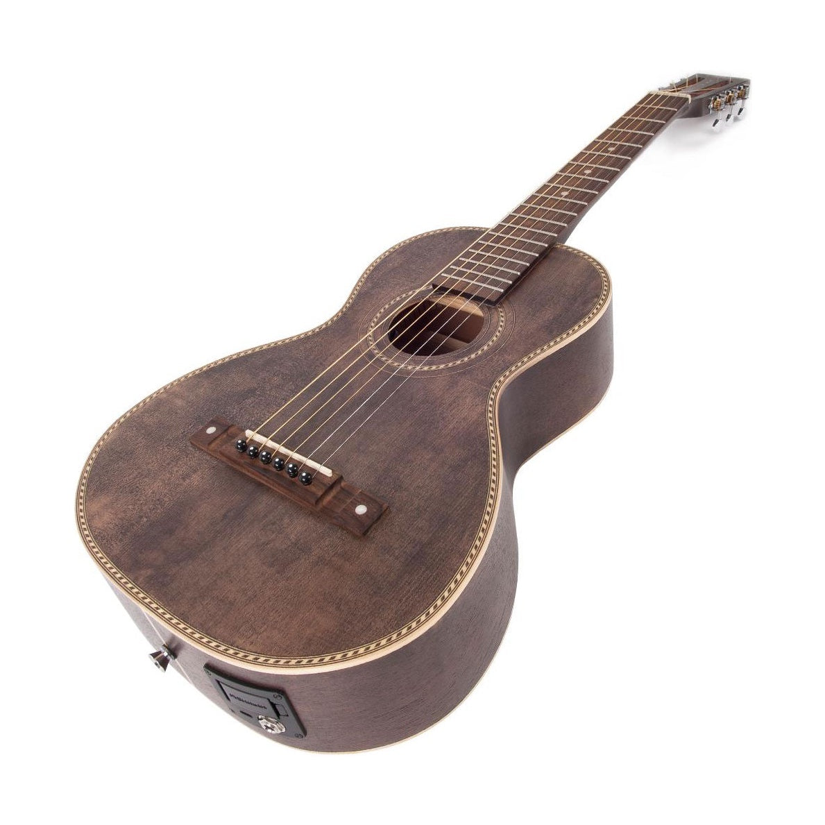 Med en elegant antikbrun satin-finish låter och ser Vintage Viator Electro-Acoustic Travel Guitar “Antiqued” ut som en äkta parlor-gitarr från 1920-talet.