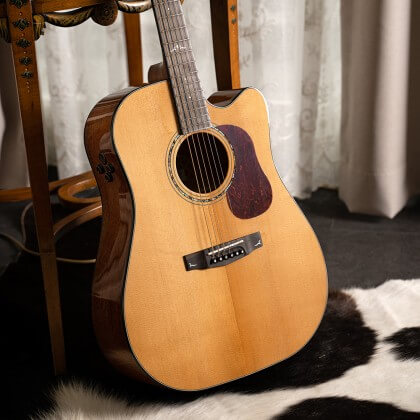 Den klassiska dreadnought-formen levererar kraftfull volym och djup bas, medan cutaway-designen ger enkel åtkomst till de högre banden. En perfekt kombination av traditionellt sound och modern spelbarhet.