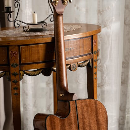 Massiv mahogny i sidor och botten skapar en rik mellanregisterton med naturlig värme och balanserad respons. Kombinationen med gran-toppen ger en tydlig men mjuk klang, perfekt för både ackord och fingerplock.
