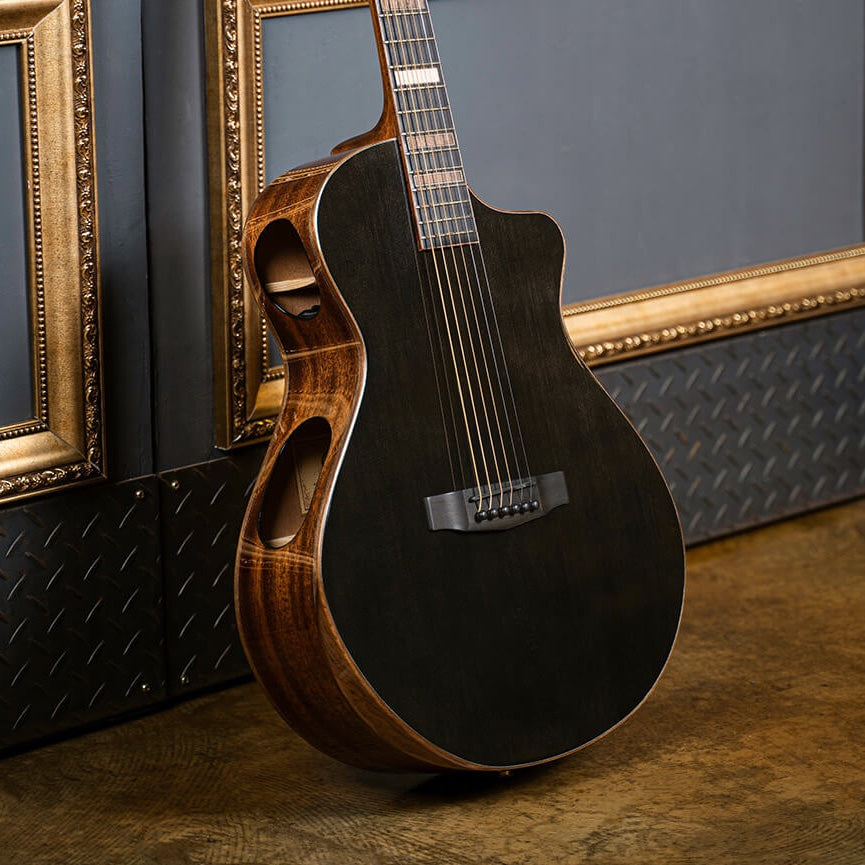 Modern Black har en nytolkning av den klassiska Grand Concert-kroppen, noggrant utformad för optimal resonans och komfort. De dubbla ljudportarna på sidorna låter både spelaren och publiken höra instrumentets naturliga akustiska ton, samtidigt som gran-toppen – fri från traditionellt ljudhål – får vibrera fritt för ökad dynamik.
