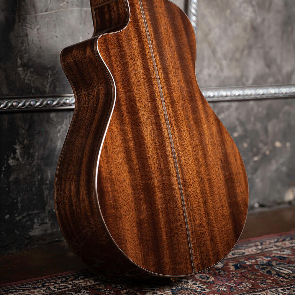 Den massiva europeiska gran-toppen i mästarklass ger kristallklar ton över ett brett frekvensområde. Denna eftertraktade träsort levererar rikedom och övertoner som ger liv åt varje nyans i ditt spel. De massiva mahogny-sidorna och -botten tillför värme och balans, vilket gör gitarren idealisk för både fingerstyle och ackordspel.
