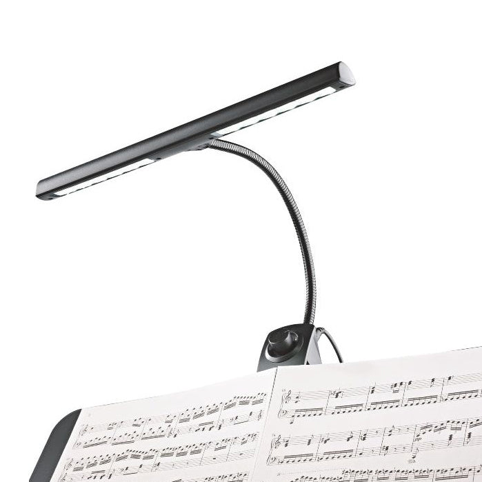 Notbelysning av extra stor modell. König & Meyer Music stand light "Dimmer Light" är en notbelysning som drivs av batteridriven eller med nätsladd, båda ingår. Du kan klämma fast den på material med en tjocklek på upp till 25mm Passar bra till notställ eller på ett instrument men lika bra att fästa på en bok när du vill läsa i mörkret. Lampan är utustad med 12st dimbara LED-lampor som sitter monterade på en flexibel svanhals så du ska finna en lämplig placering och vinkel.