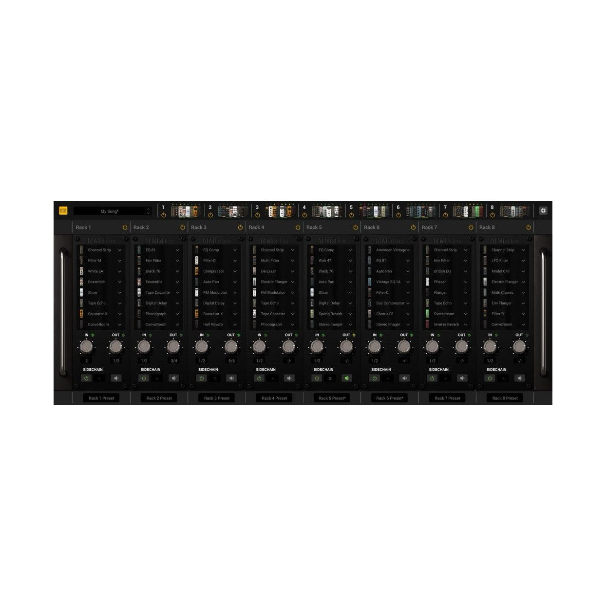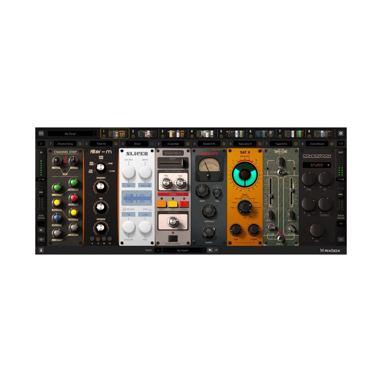 MixBox innehåller över 70 prisbelönta mixnings- och effektmoduler hämtade från T-RackS, AmpliTube och SampleTank – samlade i ett smidigt plug-in med ett stilrent gränssnitt inspirerat av den klassiska 500-serien.