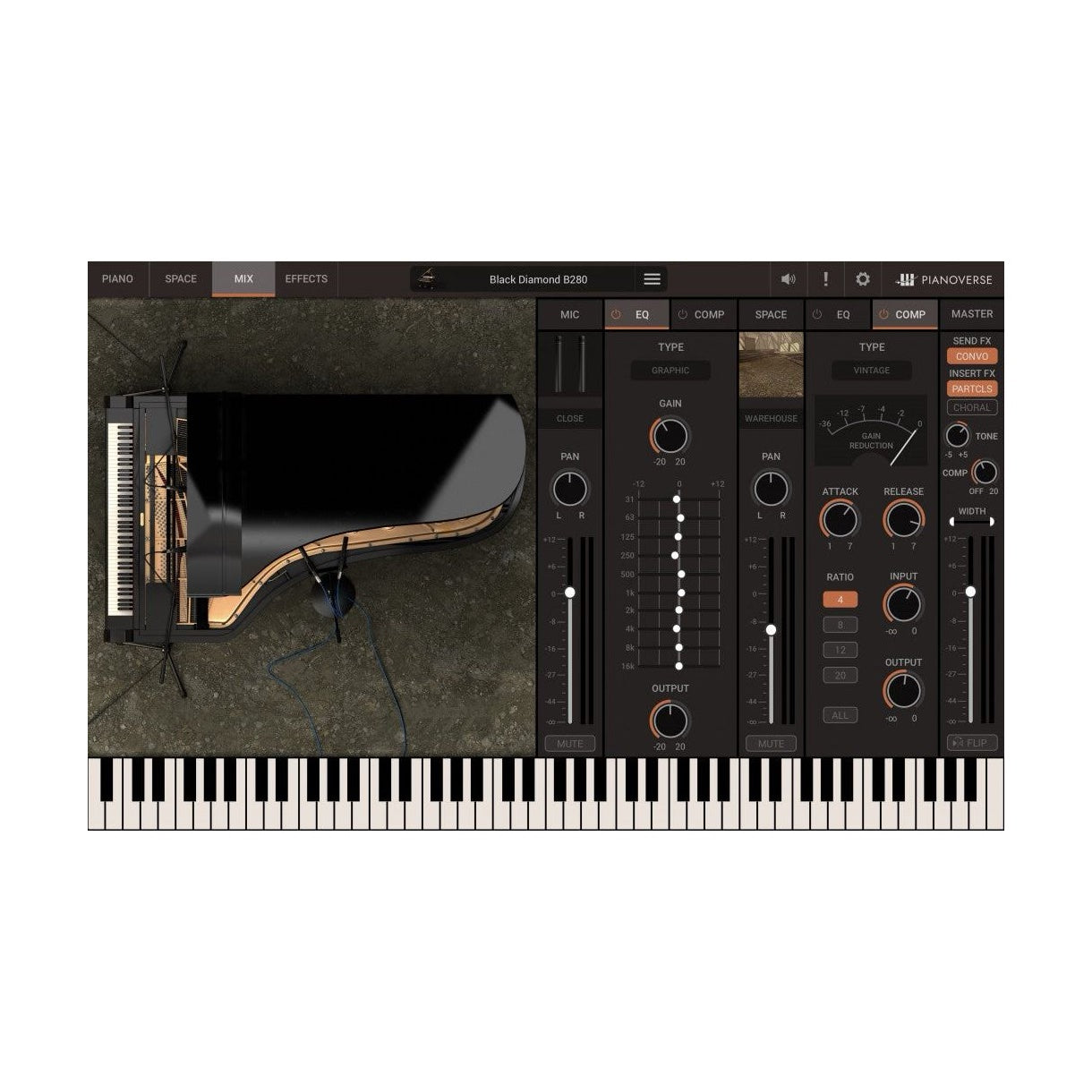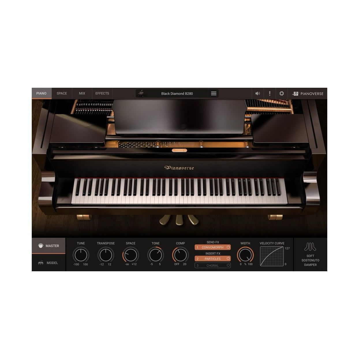 Bösendorfer 280 Vienna Concert är en majestätisk 9-fots konsertflygel som introducerades redan 1828 och har spelats av några av världens mest berömda pianister, såsom Artur Rubinstein, Vladimir Horowitz och Martha Argerich. Med ett brett tonomfång, följsam dynamik och rik övertonstruktur erbjuder den en oförglömlig spelupplevelse – nu tillgänglig i digital form genom Black Diamond B280.