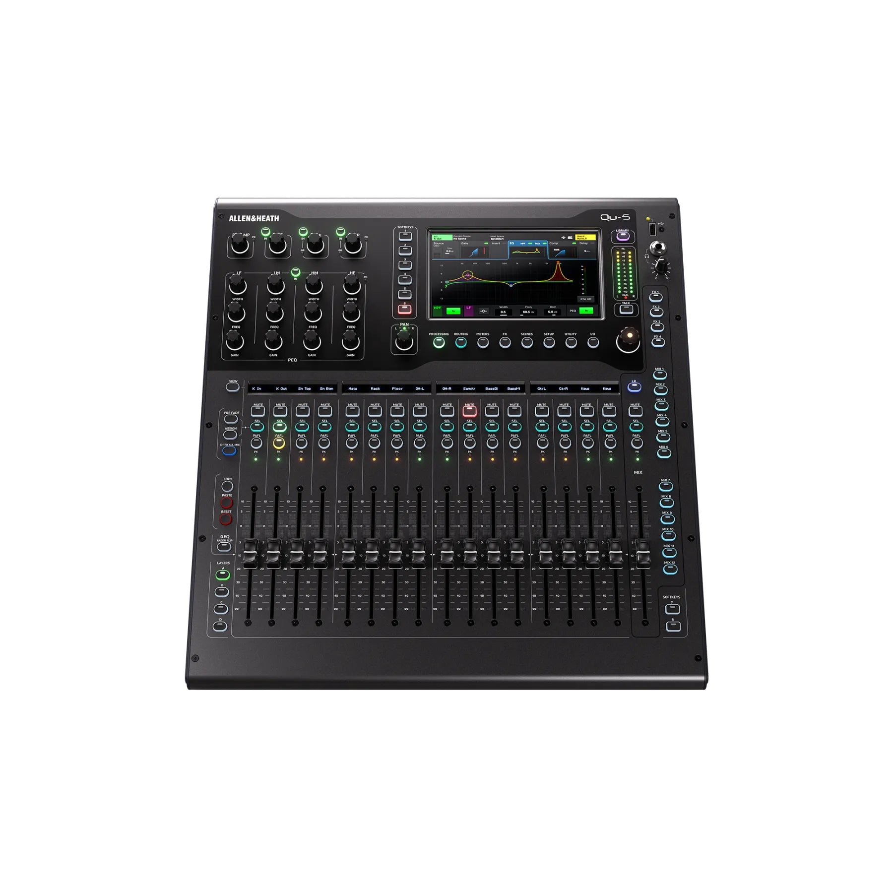 Qu-5 bygger vidare på den populära Qu-16-formfaktorn men adderar Allen & Heaths kraftfulla XCVI processing, nya effektmotorer och Everything I/O-anslutning. Den har också en större kapacitiv pekskärm, kanallistdisplayer, anpassningsbara lager och extra SoftKeys. 16 XLR ingångar, 12 XLR utgångar,  17x 100mm motoriserade reglar, 12x mixar och mycket mer.