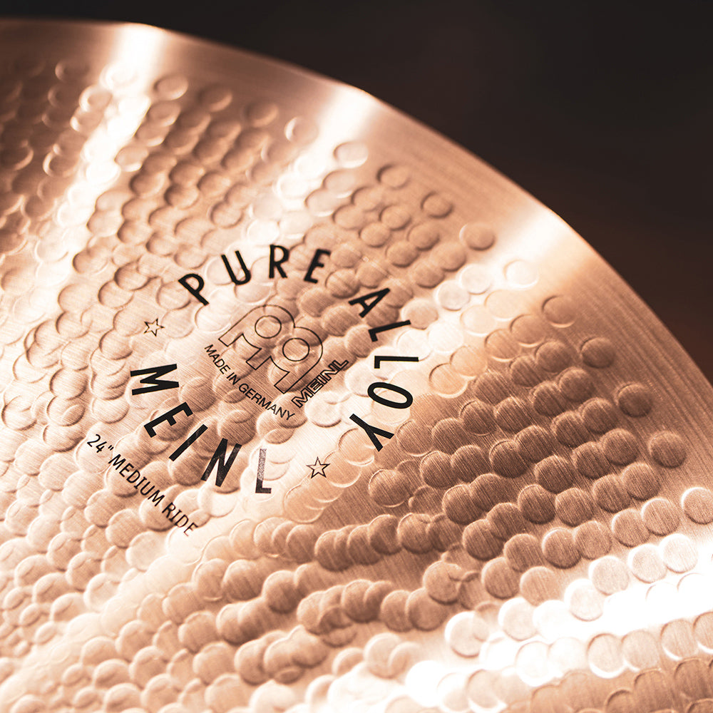 Meinl Pure Alloy har en ljus, ren tidlös klang.Tillverkningen sker i den tyska fabriken med computor hammering och speglar de mellaneuropeiska kontrollerade ljusa sounden präglade av jämnhet. Även om klangen är ljus så finns en snygg träig attack på ridecymbalerna omgiven av en snygg dusch.