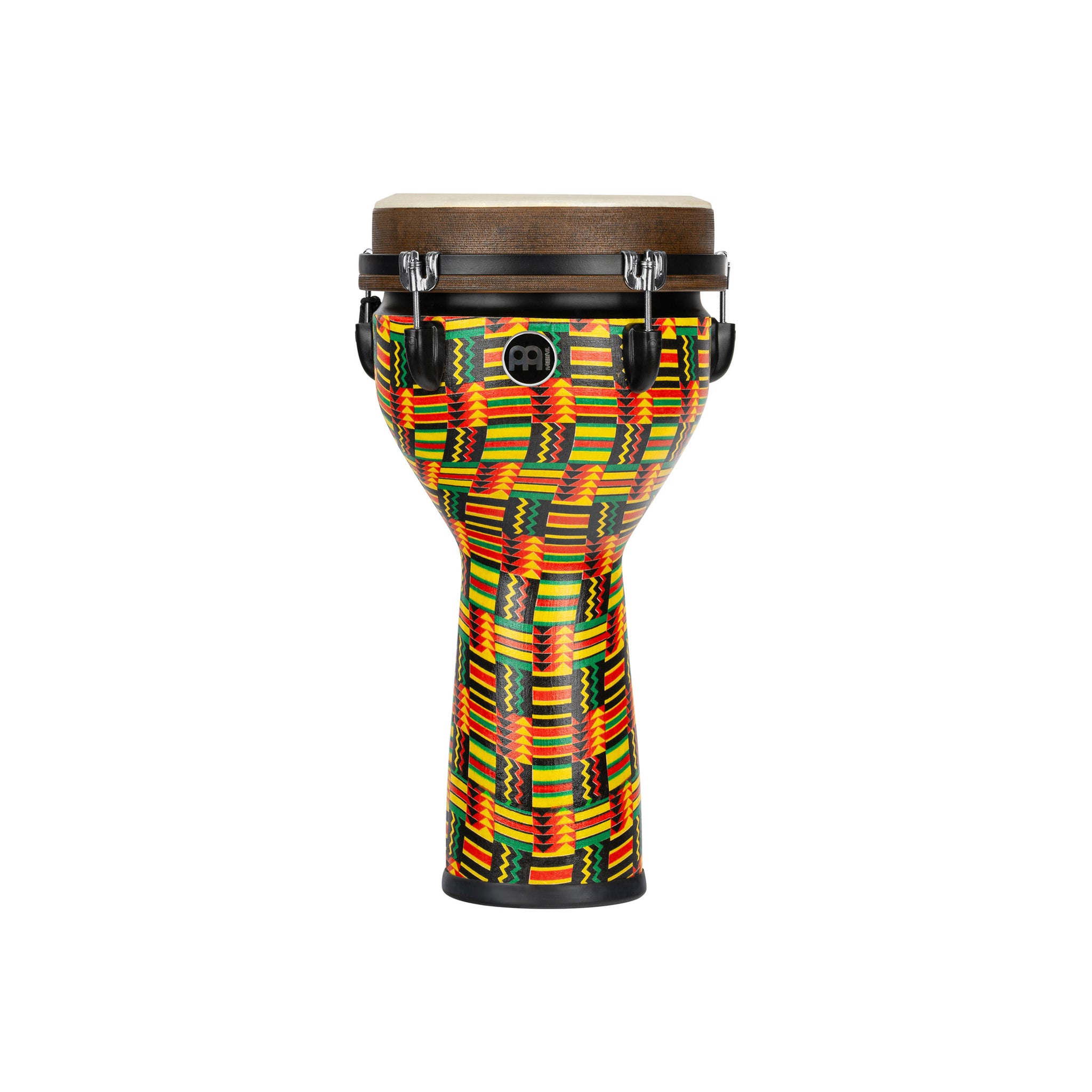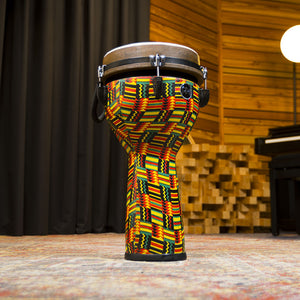 Both the skin and the frame are made of 100% synthetic material and do not lose their feel with changes in temperature or humidity. The combination of synthetic leather and body provides focused "slap" sound and a rich robust "low end". The lightweight construction makes this djembe an ideal travel partner. A simple mechanical tuning system anchored with powerful mechanics provides a consistent and reliable djembe sound! The Jumbo Djembe works equally well on stage or in the studio or in a classroom!