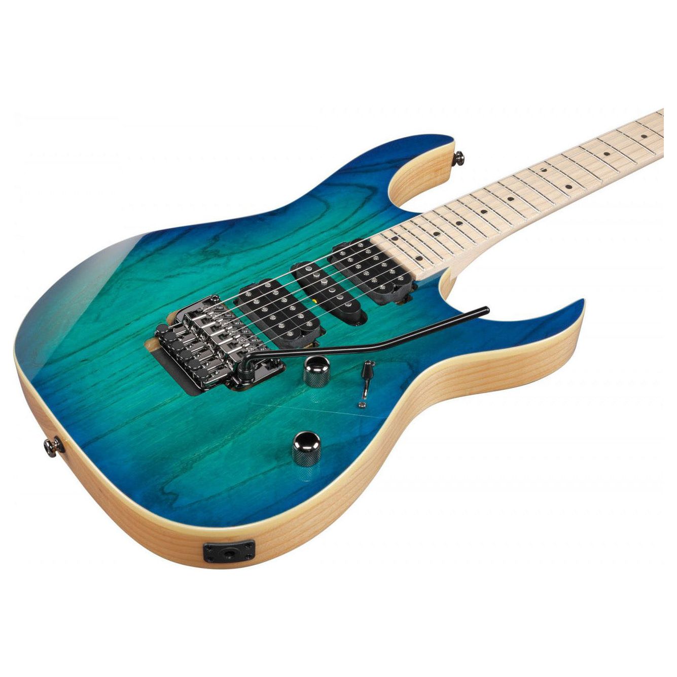 The guitar is lacquered in a blue finish where the grainy ash body shines through.