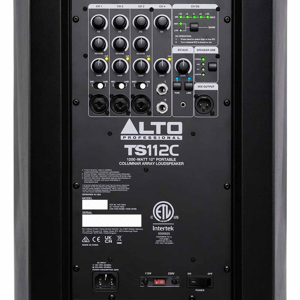TS112C fungerar som ett komplett PA-system tack vare den integrerade 5-kanals mixern. Här finns anslutningar för mikrofoner, instrument och externa ljudkällor, vilket gör systemet användbart i många olika sammanhang. Ljudinställningar kan även justeras via mobiltelefon med Alto Pro-appen.