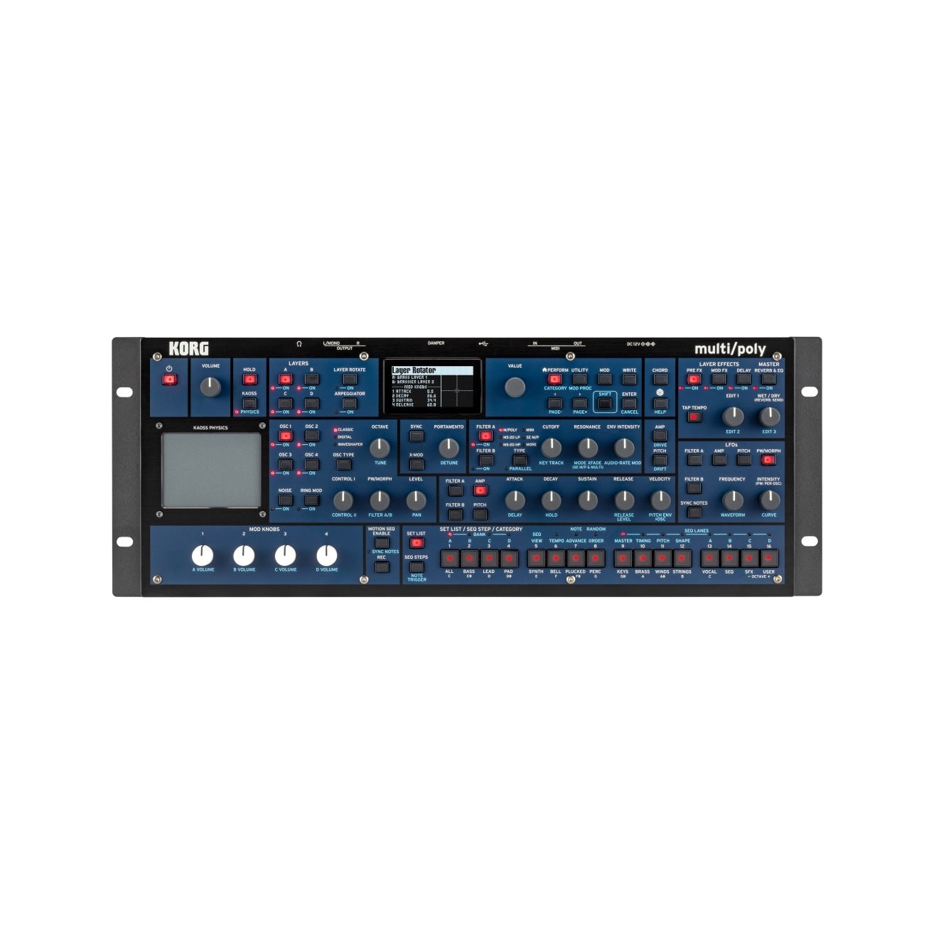 KORG multi/poly Module är en kraftfull synthesizermodul inspirerad av den legendariska KORG Mono/Poly. Den kombinerar autentiska analoga klangkaraktärer med modern digital teknik och avancerad ljuddesign, vilket gör den till ett flexibelt verktyg för både studio och liveframträdanden.