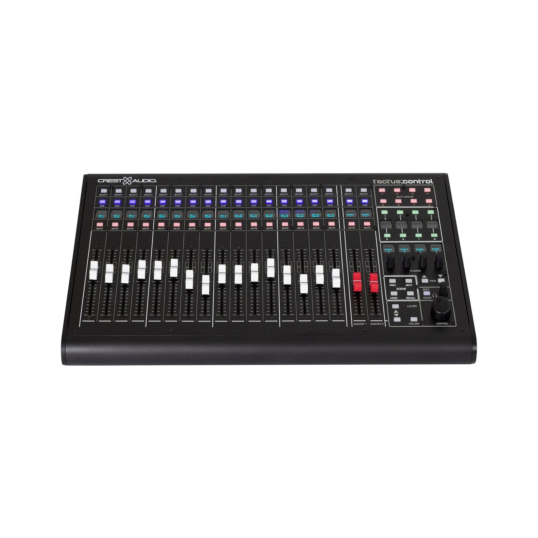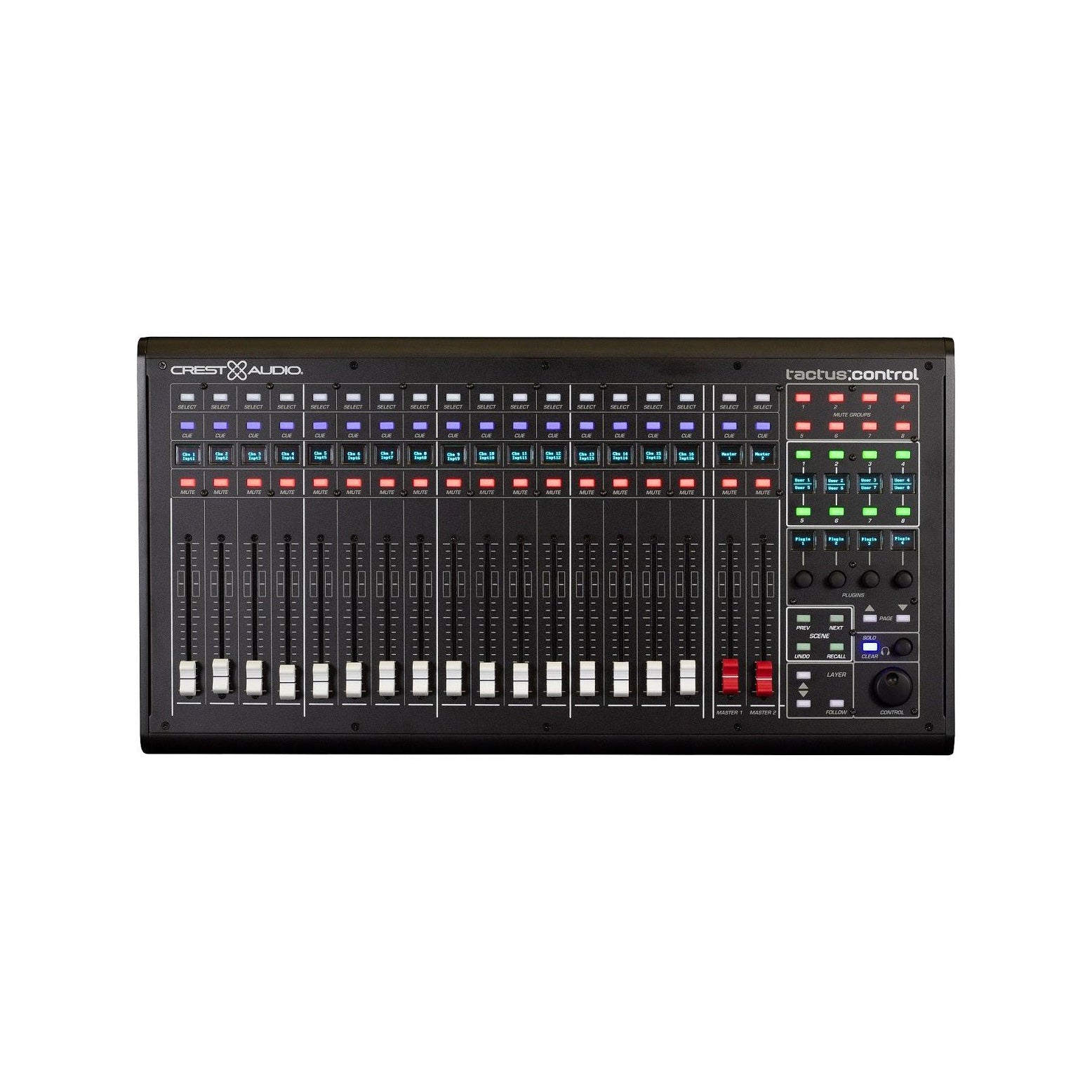 - 16 motoriserade kanalreglar, var och en med: Belysta knappar för Mute, Cue och Select, OLED-skrivfält (flerlinjigt) för kanalidentifiering