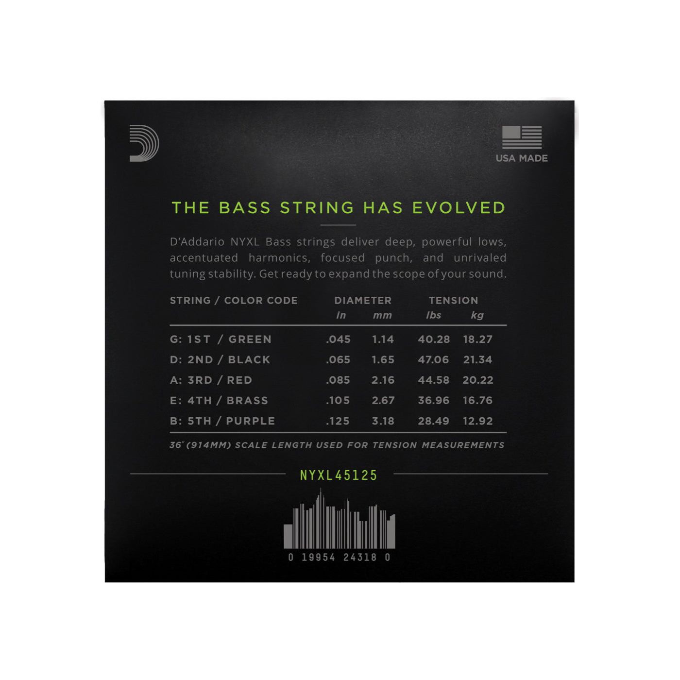 The NYXL Bass combines D'Addario's steel carbon core, NY STEEL, with a redesigned nickel-plated steel spinning. This construction provides a deep and powerful bass tone with a focused, tight and punchy midrange and a complex harmonic range. Designed for all playing styles, the NYXL Bass has a greater dynamic range and longer sustain than any other bass string.