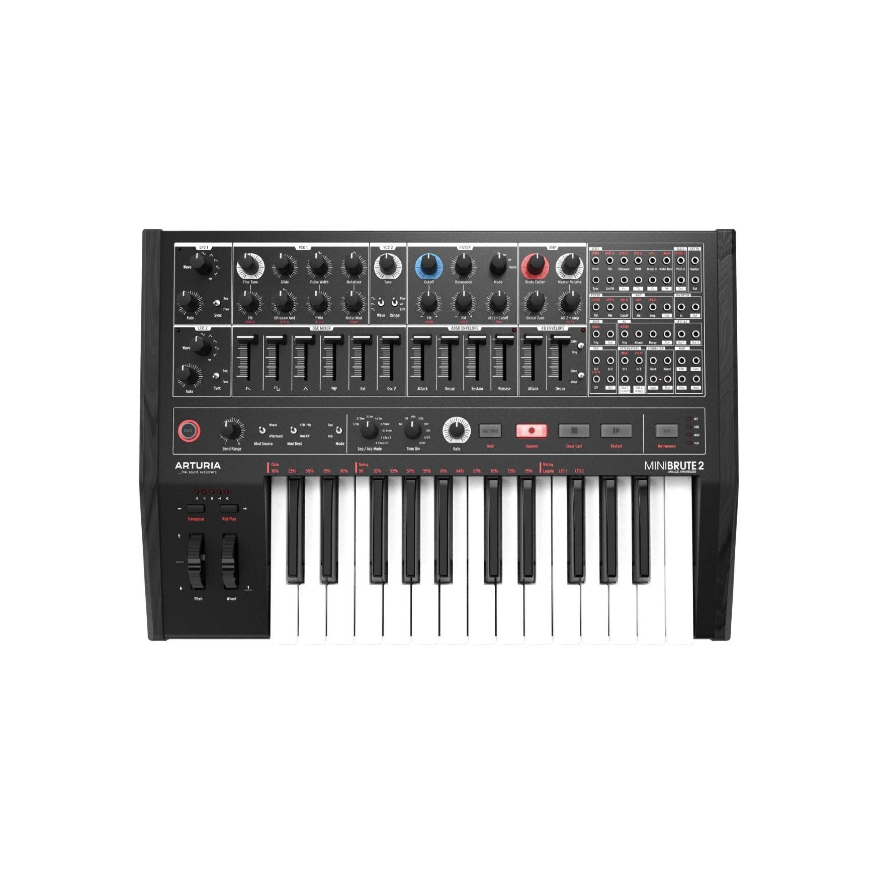 MiniBrute 2 Noir Edition tar Arturias banbrytande analoga design till nästa nivå. Den integrerade patch-bayn öppnar dörren till oändliga modulära kombinationer och djup ljudformning, medan den klassiska Steiner-Parker multimode-filtret ger karaktär och värme till varje ton. Perfekt för allt från experimentella ljudlandskap till rena, punchiga basar och skärande leads.