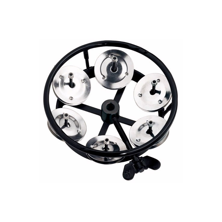 Tamburin för montering på Hi-hat-stången. Ger tamburinljud varje gång du "trampar ner hihatfoten". Perfekt för att lägga tamburin på "2 och 4". En övre ring skyddar jinglarna/bleck. Enkelt och snabbt att montera på och ta av efter behov mellan låtar. Stainless Steel Jingles/Bleck ger ljust.