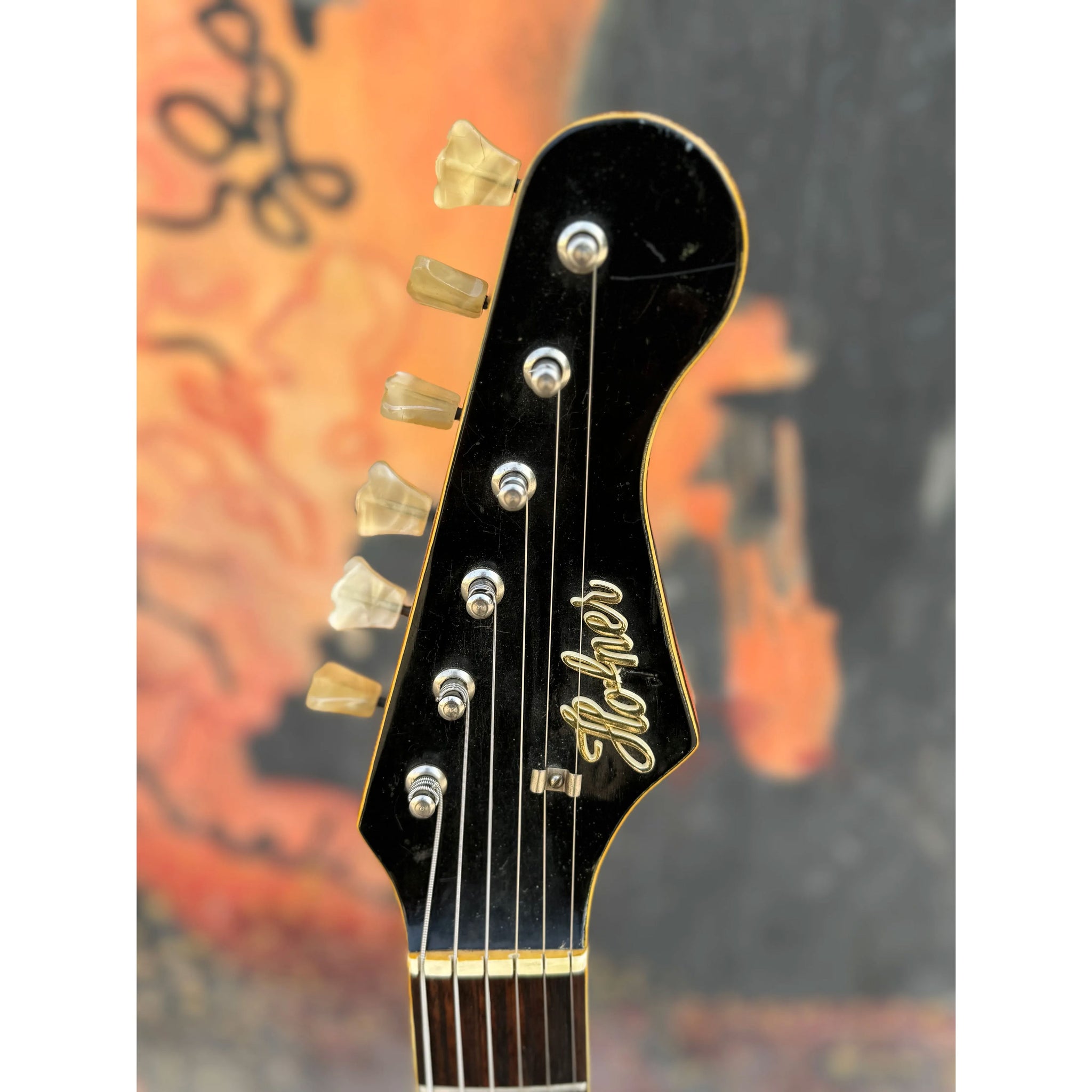 Denna modell kallades Höfner Galaxie utanför Tyskland och var Höfners toppmodell bland elgitarrer på den tiden. Gitarren är helt original och i utmärkt skick för sin ålder. Några små märken och lättare spelspår, men inga större problem eller dolda reparationer. De originalmonterade banden är fortfarande i mycket gott skick och de tre Höfner humbucking-"staple"-mikrofonerna låter fantastiskt! En mycket mångsidig gitarr, lätt i vikt och väldigt bekväm att spela på. Levereras i en tidsenlig case av äkta papp med läderstroppar vilken enligt vår mening bör vara original!
