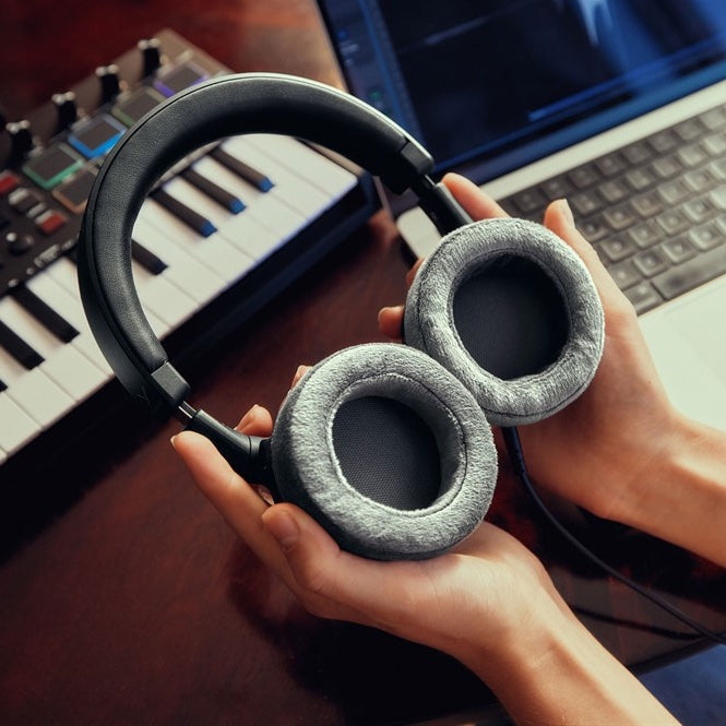 Den robusta konstruktionen med höljeskomponenter i högkvalitativ plast och huvudbygel i fjäderstål gör hörlurarna tåliga för daglig användning. De mjuka velourkuddarna och den vadderade huvudbygeln säkerställer långvarig komfort även under långa pass. Öronkuddarna är utbytbara för längre livslängd.