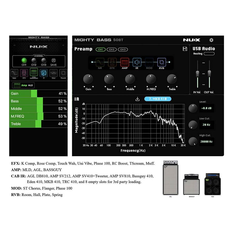 You can use it in the bedroom or even in a small club when using the DI output. NUX's TSAC modeling technology offers several great sounding amp models and all the essential effects with excellent playability and response. Using Impulse Response technology, the Mighty Bass 50BT offers several highly realistic speaker cabinet simulations, each with its own recognizable character.
