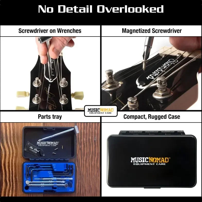 erktygssats i lätt och robust aluminiumetui innehållande truss rod-nycklar och insex-nycklar i flera olika storlekar samt skruvmejslar.