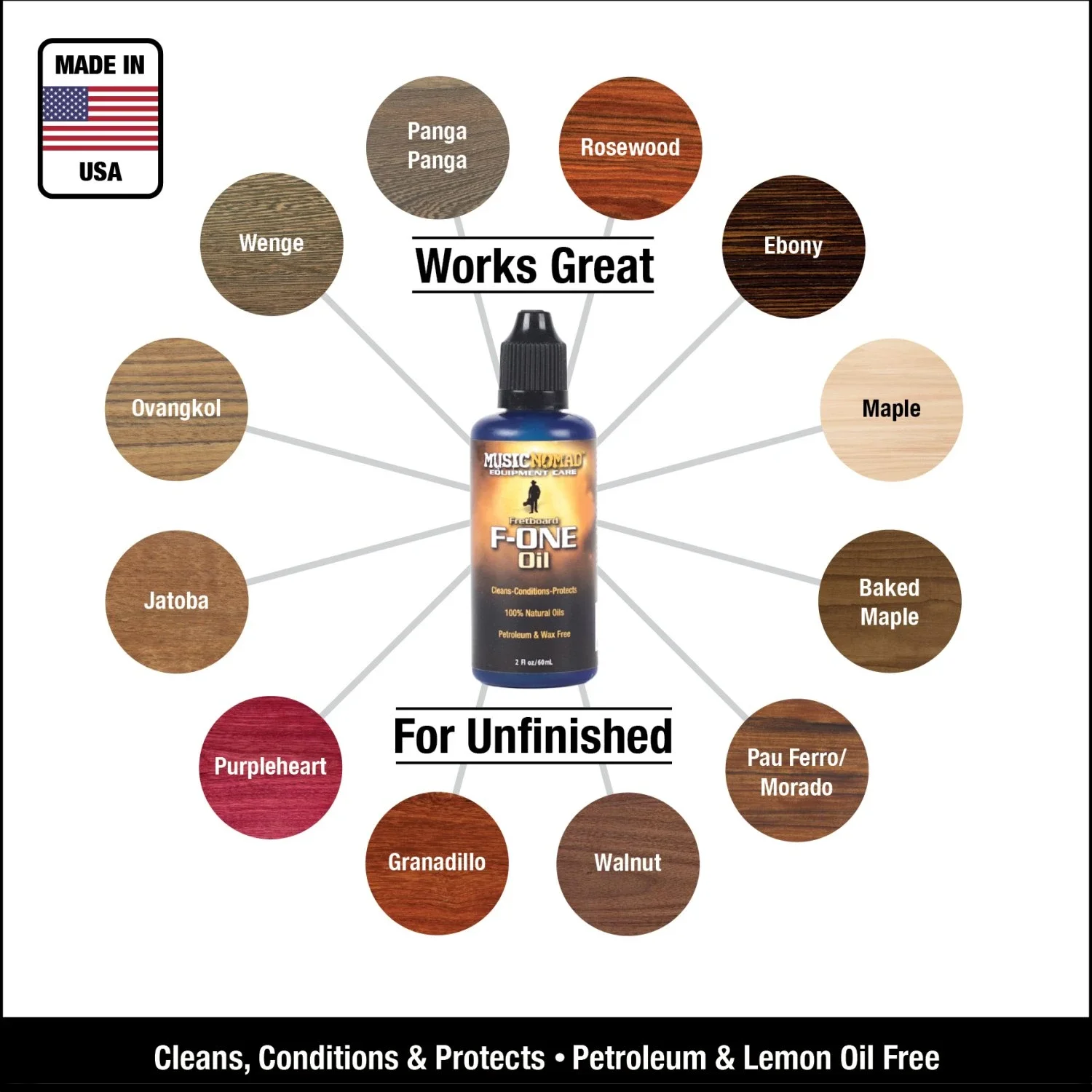 Med Nomad Tool set tar du enkelt bort damm även på ställen där det är svårt att komma åt. För att ta bort fläckar, fingeravtryck mm. och för att ge lyster till finishen används Guitar Detailer som fungerar lika bra på kroppen som på halsen oavsett blank eller matt lack. Har du en olackad greppbräda på ditt instrument så är F-One Oil din bästa vän som både rengör och återfuktar greppbrädan på samma gång. För lackade greppbrädor så är GuitarDetailer vägen att gå.