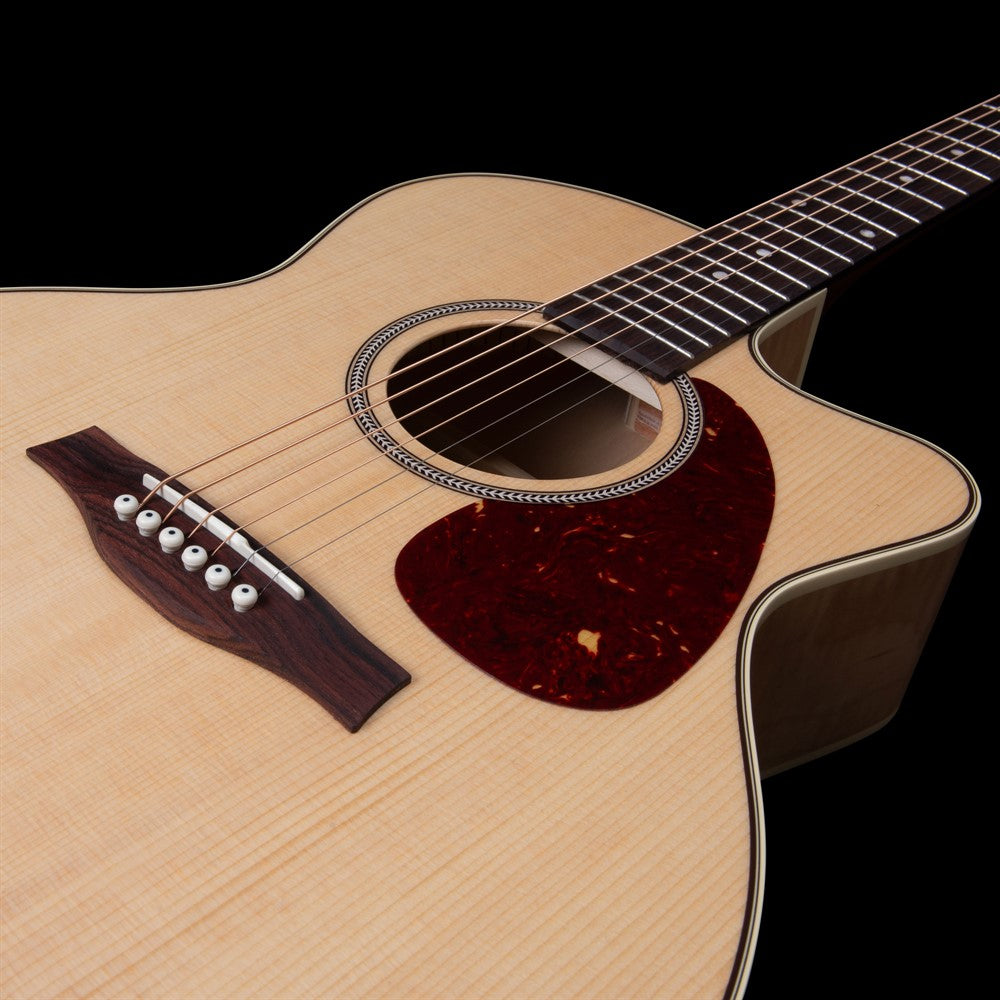 Mini Jumbo Westerngitarr med solitt granlock och sidor/botten i flammig lönn, i en snygg natural high gloss finish. Utrustad med ett Presys II EQ-system som fångar varje nyans av ditt spelande, både på scenen och i studion.