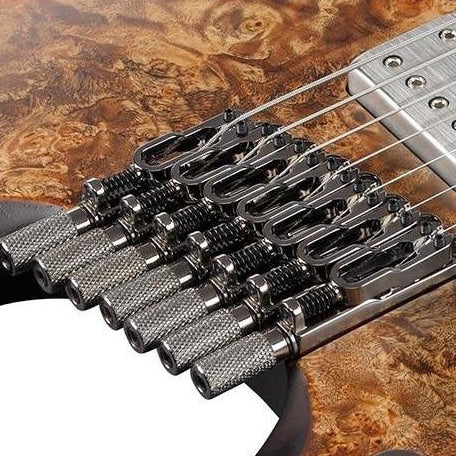The string lock is a one-piece construction that is very easy to work with when string breaks and which holds the string securely in place. Together with the Mono Tune stable, designed so that you use regular string sets and don't have to keep up with double ball end strings, you can calmly continue on the strings you've always used. The Mono Tune stand can be described most simply as each string has its own stand, they do not sit together but are like 7 stands sitting next to each other. It provides a very good transfer between the vibrations of the string and the body, which gives a natural and organic tone. The bridge also has a very wide intonation range so if you want to retune and use thicker/thinner strings it's no problem. It is easy to change strings, easy to tune and easy to adjust. A very well functioning stable.