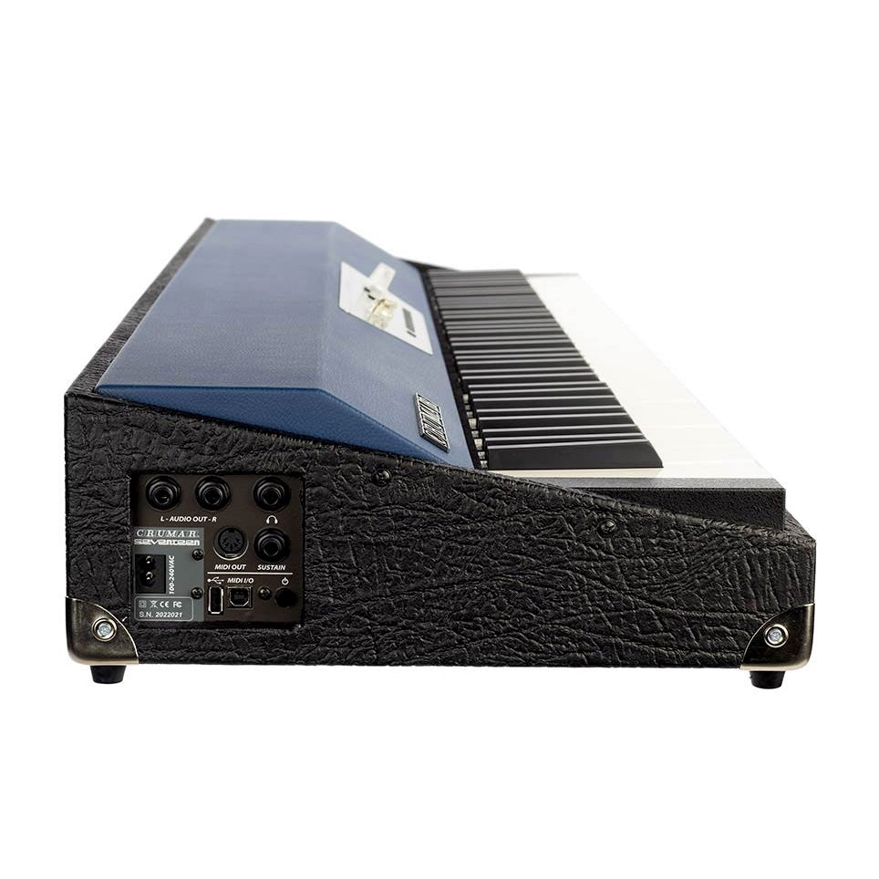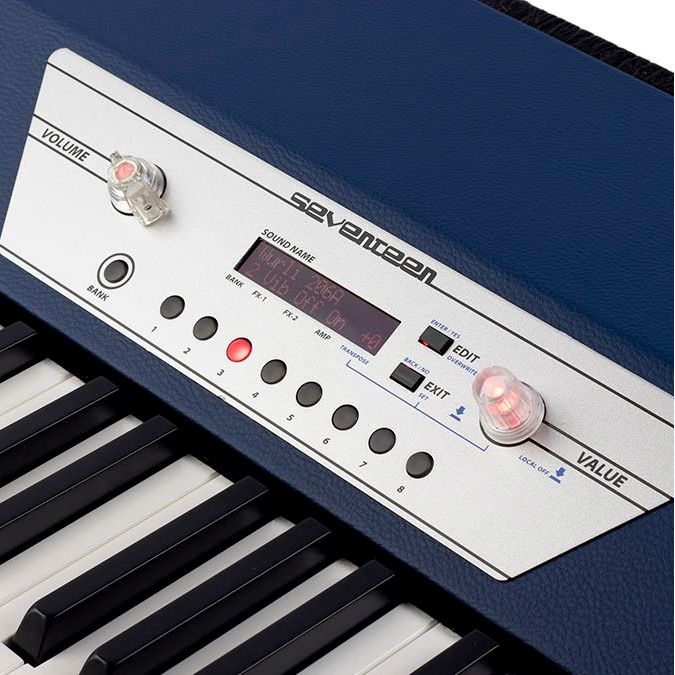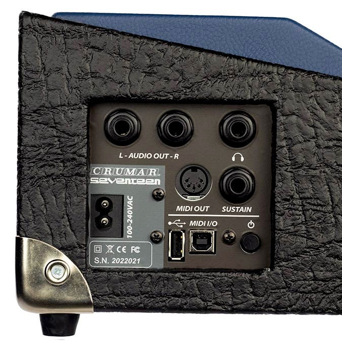 Seventeen är inspirerat av 80-talets estetik och kommer i svart och blå tolex. Med sitt träkabinett och samma 73-tangenters hammer-action-klaviatur som Crumar Seven erbjuder det en autentisk och responsiv spelupplevelse. Samtliga anslutningar sitter praktiskt placerade på instrumentets vänstra sida.