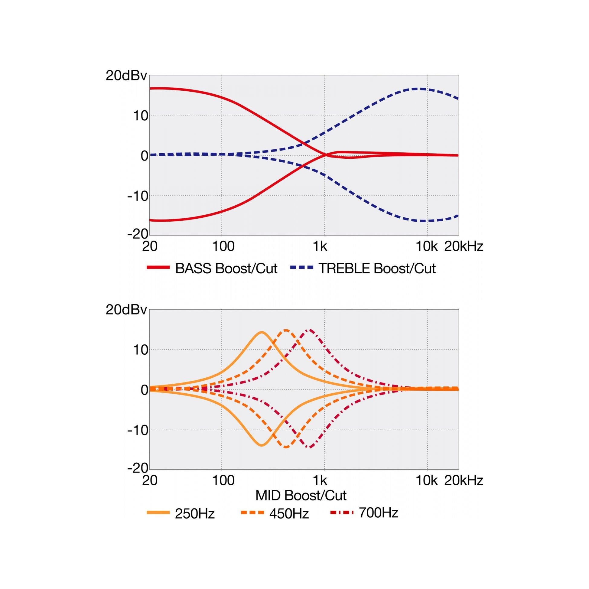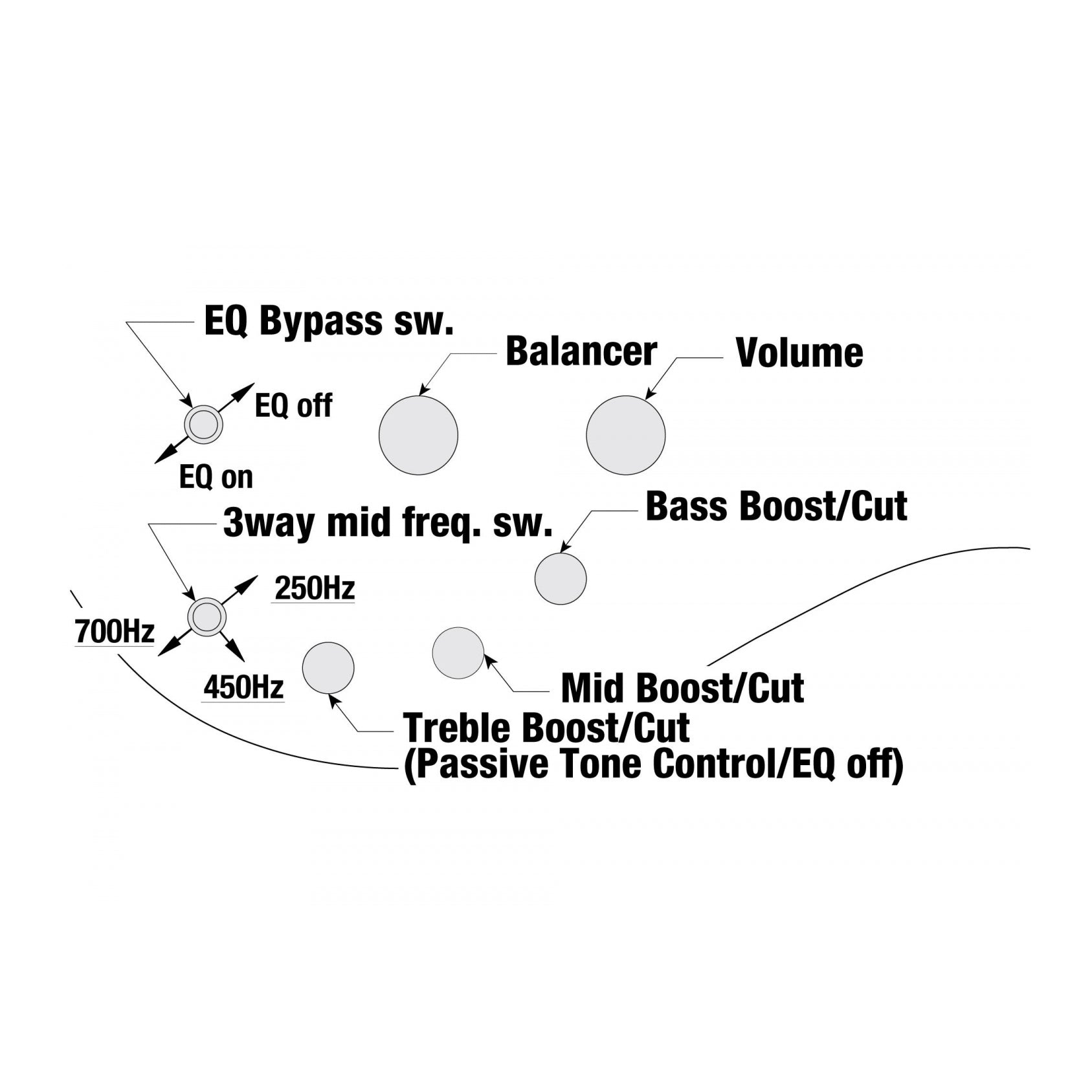 Gemensam volym och pott för pickupbalans. Stallet är Ibanez Mono-Rail IV, ett stall som designat för att isolera strängarna från varandra. Isoleringen ger optimal överföring av strängens vibrationer ner i kroppen utan att strängarna påverkar varandra. Ett stabilt och mycket lättjusterat stall. Halsen är förstärkt med KTS titanförstärkning, två stavar som ligger parallellt med truss roden och stabiliserar upp halsen. Det gör halsen mindre känslig för förändringar i luftfuktighet och halsen mindre benägen att vrida sig eller få en puckel vid 12-band. Stavarna hjälper också till att eliminera döda toner som uppstår av/från att halsen självsvänger.
