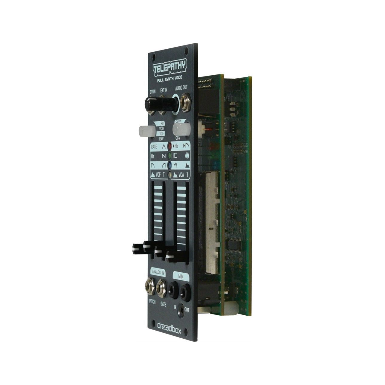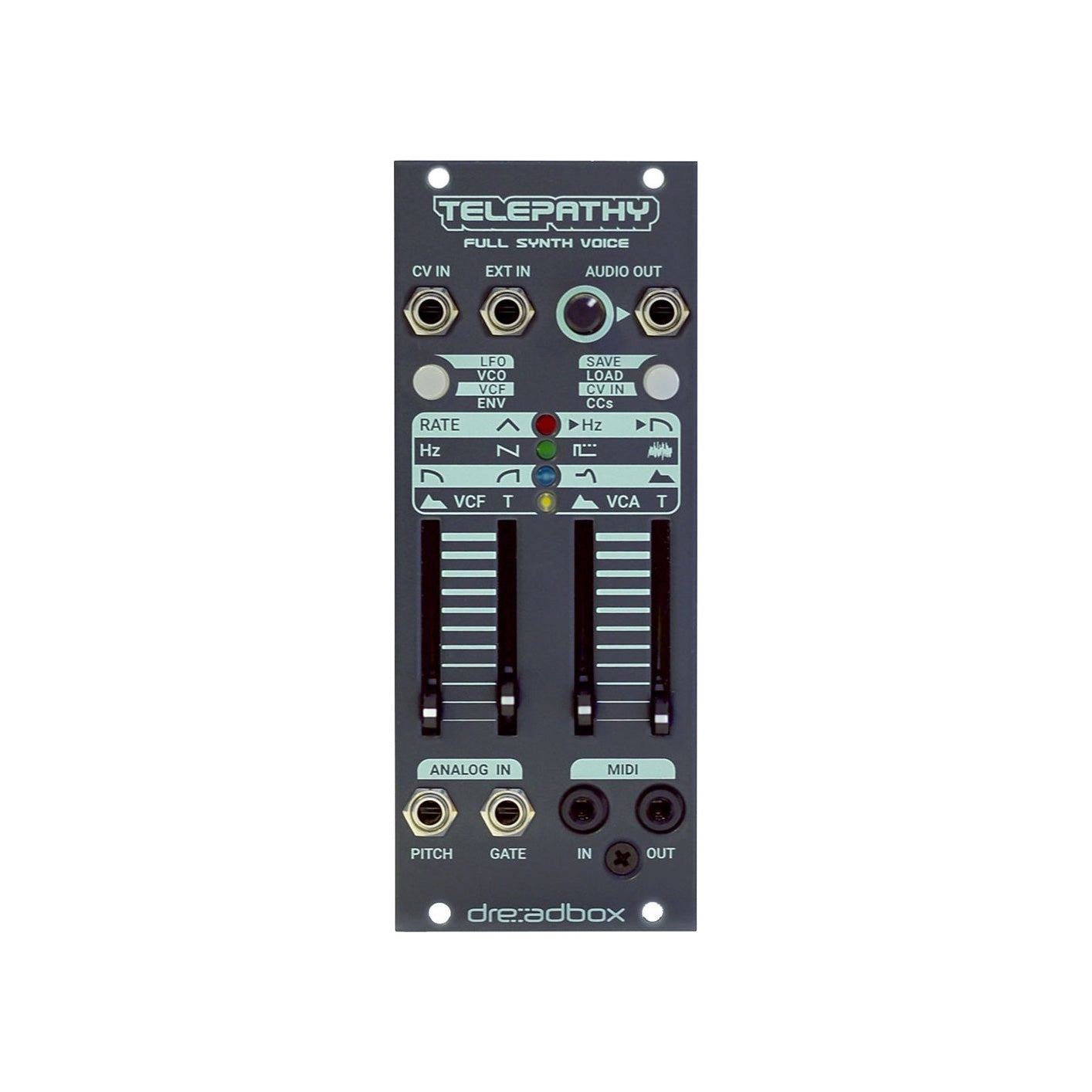 Telepathy är en komplett analog synth-röst i ett extremt kompakt Eurorack-format. Med oscillator, suboscillator, dubbla filter, komplex LFO, två envelopes, VCA, presets, MIDI och CV-kanalering får du ett helt syntsystem i endast 10 HP.