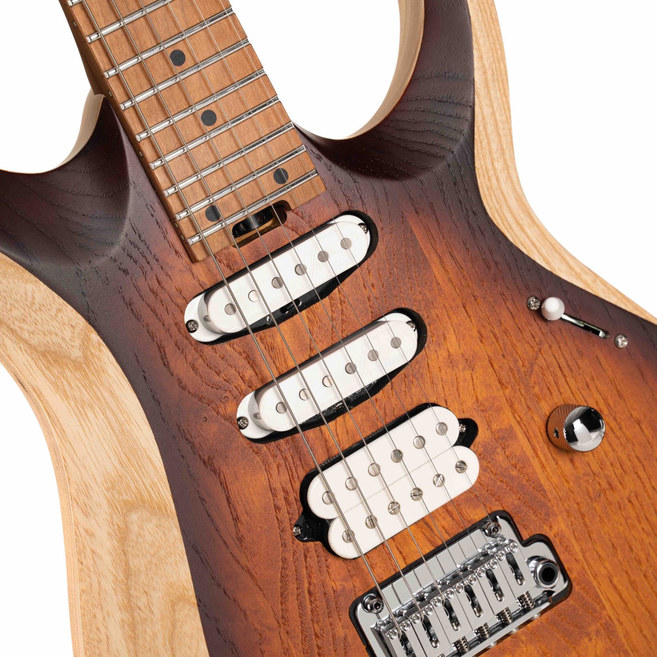 Den femdelade halsen i rostad lönn och valnöt erbjuder optimal styrka, stabilitet och ett fokuserat ljud som harmonierar perfekt med kroppens resonans. Den värmebehandlade konstruktionen förbättrar både sustain och tonöverföring.