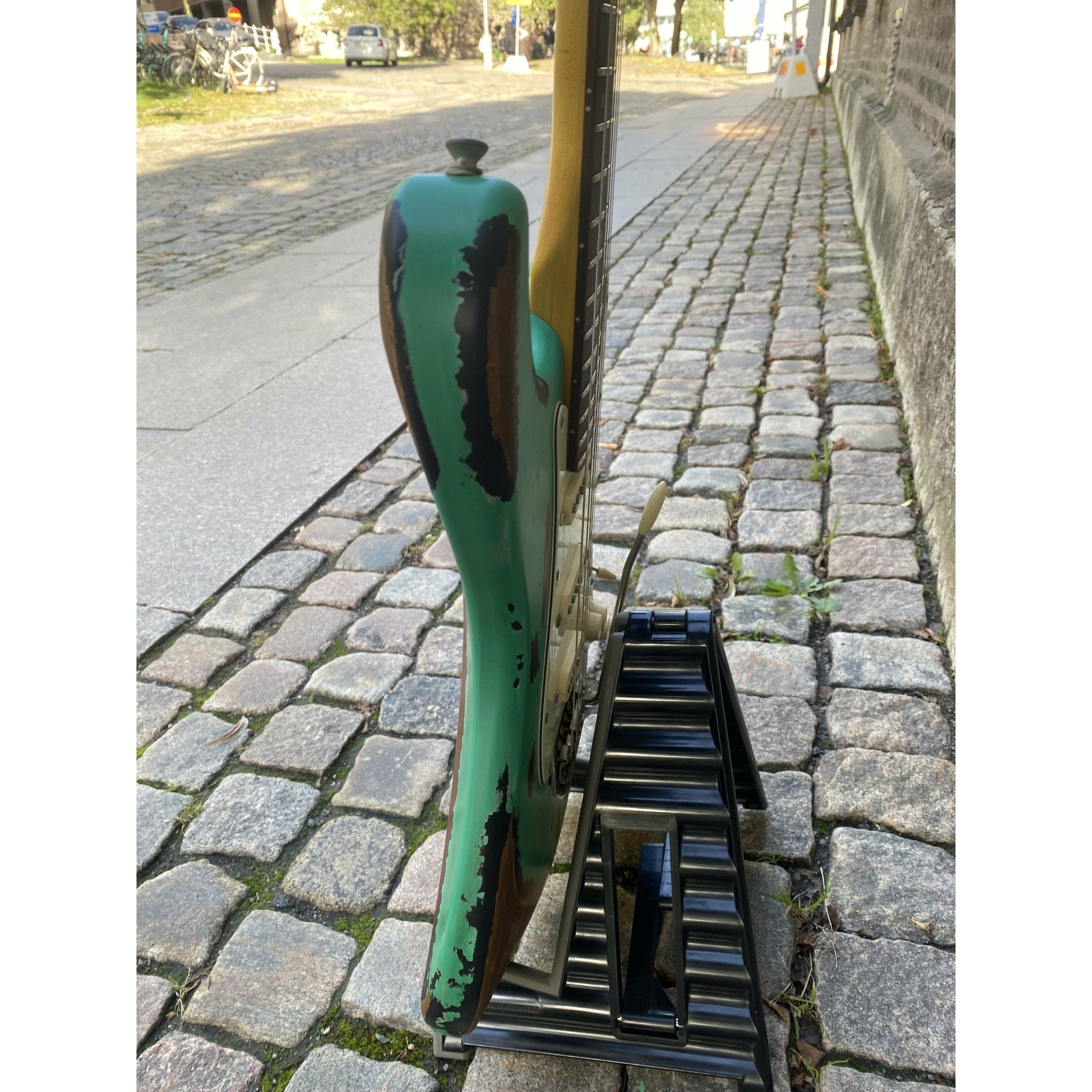 Starting life as a V6MRSSB with a Sunburst finish, the body has been sprayed with a white acrylic undercoat with an acrylic Ventura Green lacquered topcoat, then professionally aged to reveal areas of the original Sunburst and natural wood on the body front and back. The neck itself is a thing of beauty, sleek, fast, and carefully aged, and for that unmistakable killer look, along with the headstock and classic cigarette burn, is given a cellulose amber coating.