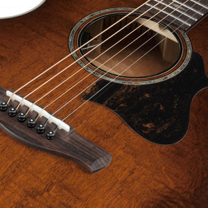 Kropp och lock är av flammig Okoume, förutom vacker, ger en träig, varm, ton som har en mjuk och dynamisk respons när man spelar med fingrarna och punchy, hög-midd, med klar projicering när man spelar med plektrum. Att få in elektronik, preamps och mikrofoner i akustiska instrument är alltid en kompromiss med det akustiska ljudet i instrumentet. På denna AE modell sitter en Ibanez T-bar Undersaddle pickup monterad, som ihop med den aktiva preampen ger dess naturliga sound.