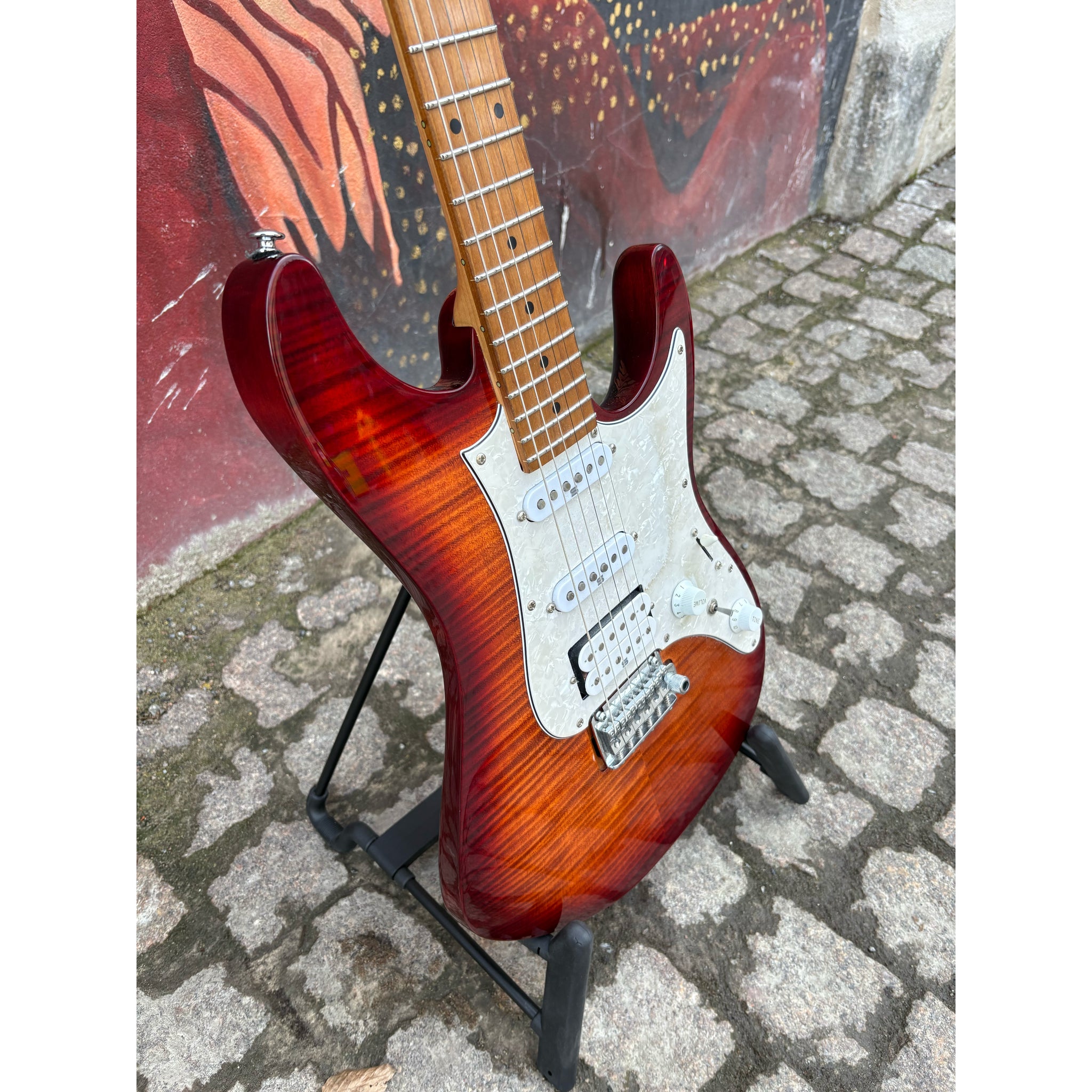 AZ224F har en topp i flammig lönn på en kropp i amerikansk lind, bultad till en hals i rostad lönn med en greppbräda i rostad lönn med 22 rostfria band, svarta punktmarkeringar och självlysande sidomarkeringar.