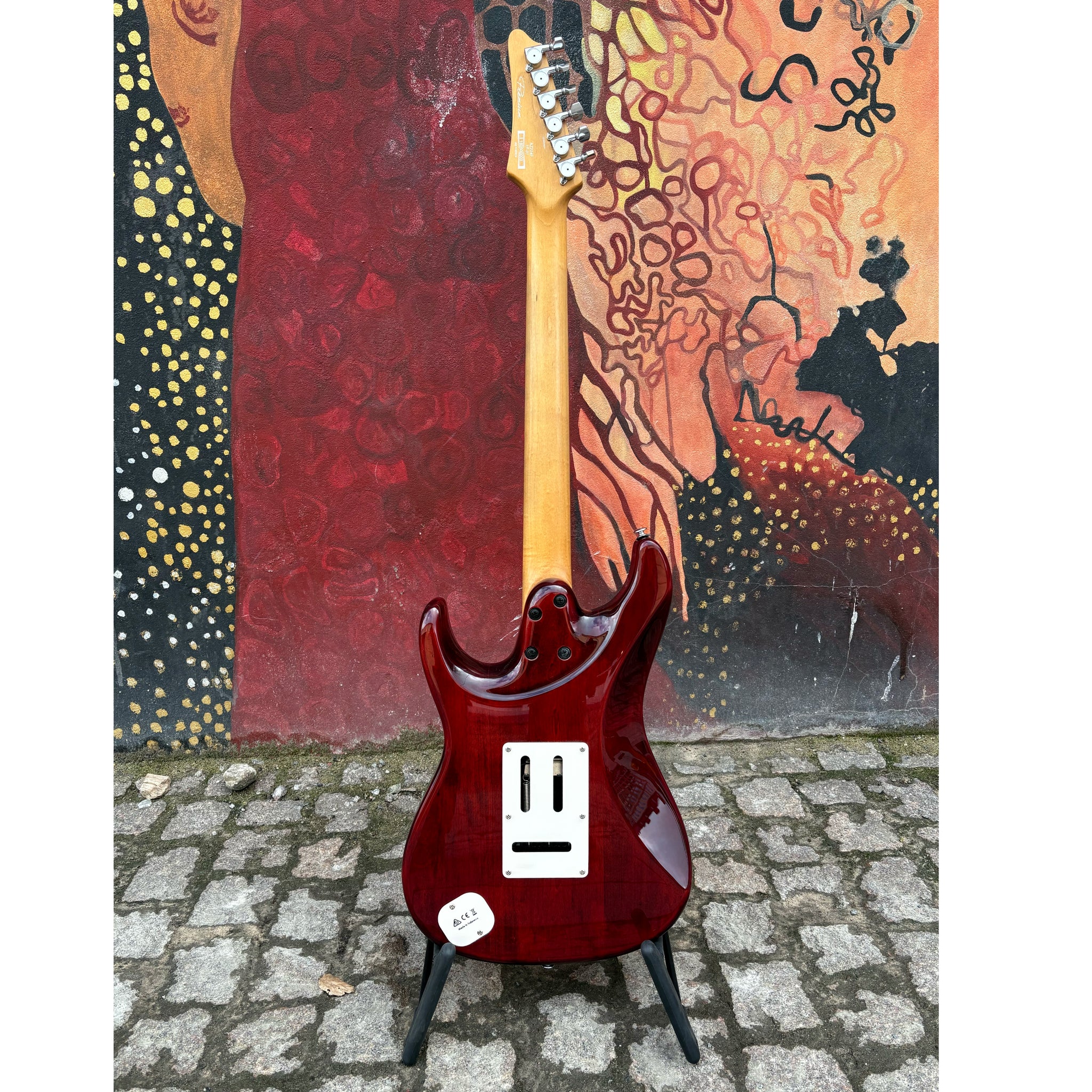 Komponenterna inkluderar Seymour Duncan Hyperion-pickuper monterade på ett vitt pärlemorskimrande plektrumskydd, med en humbucker vid stallet och singlecoil-pickuper i hals- och mittposition. Den är även utrustad med ett Gotoh T1502 tvåpunkts svaj, en Graph Tech TUSQ-sadel samt Gotoh låsbara stämskruvar